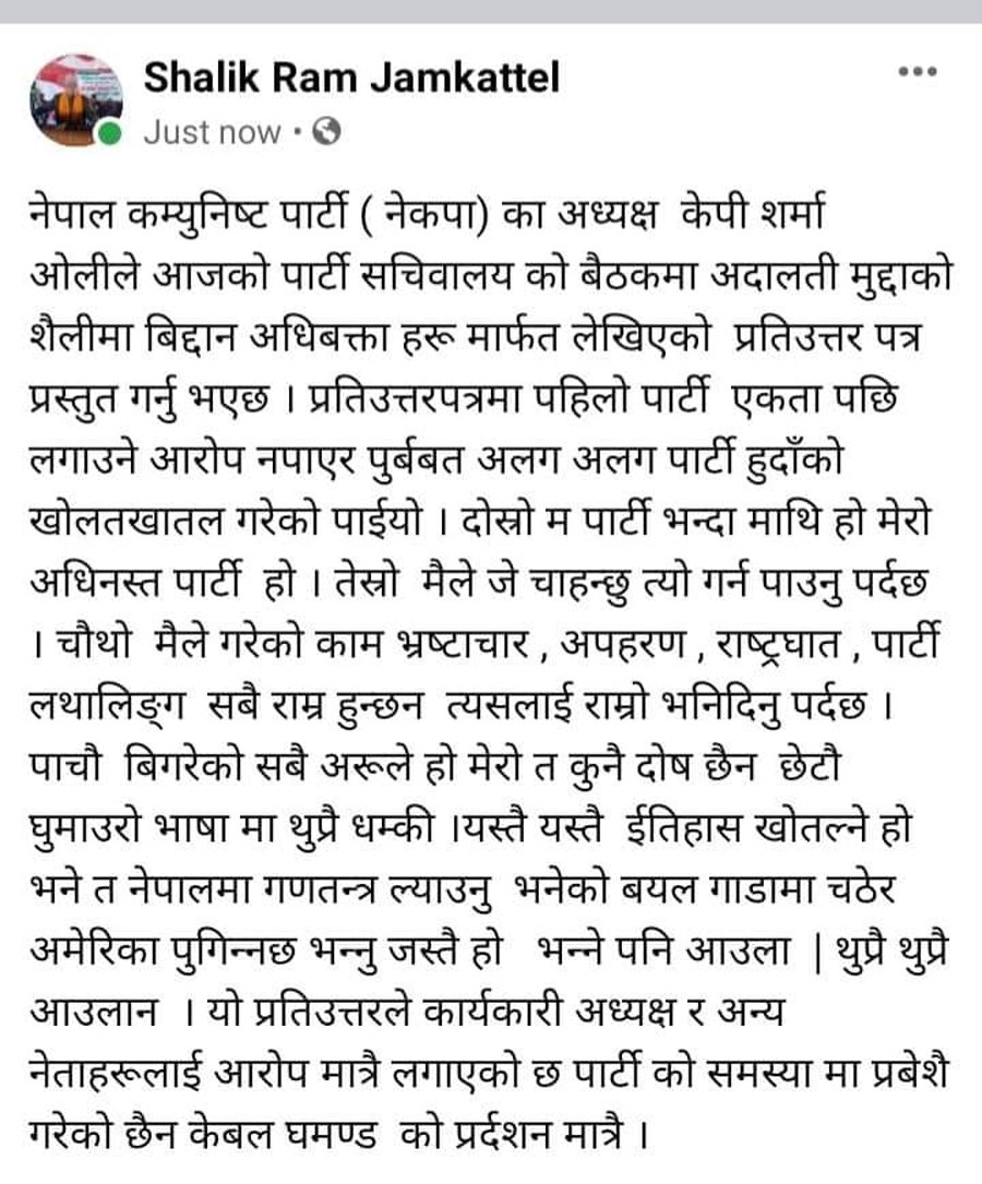 प्रचण्डले सचिवालमा पेस गर्नु भएको प्रतिवदेनको उत्तर दिनु पर्ने भएकोले १० दिनको म्याद मागेर शनिबार सचिवालयमा प्रस्तुत गर्नु भएको प्रस्तावको बारे आफ्नो धारण व्यक्त गर्दै जमकट्टेलले फेसबुक मार्फत ओलीको प्रतिउत्तर घमण्डको प्रर्दशन भएको टिप्पणी गर्नुभएको हो ।