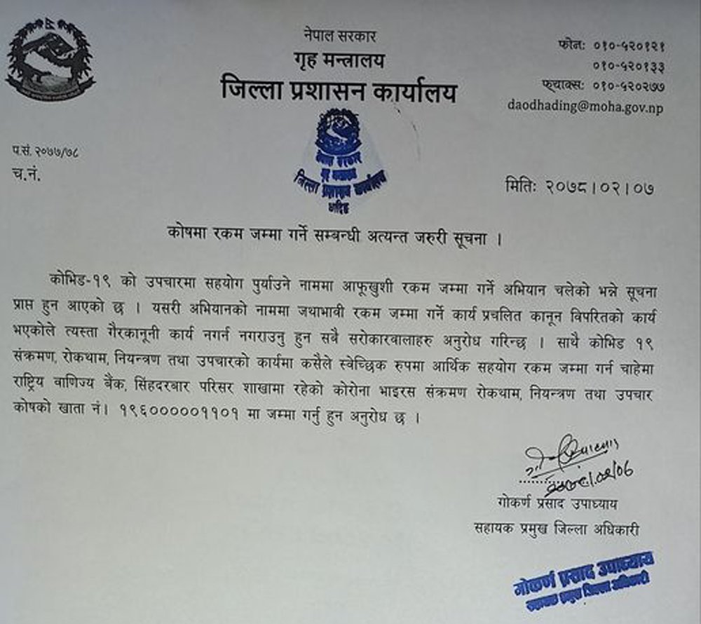 धादिङ जेष्ठ ७ । जिल्ला प्रशासन कार्यालय धादिङले कोरोना रोकथामको नाममा आफुखुसी रकम संकलन नगर्न निर्देशन दिएको छ ।