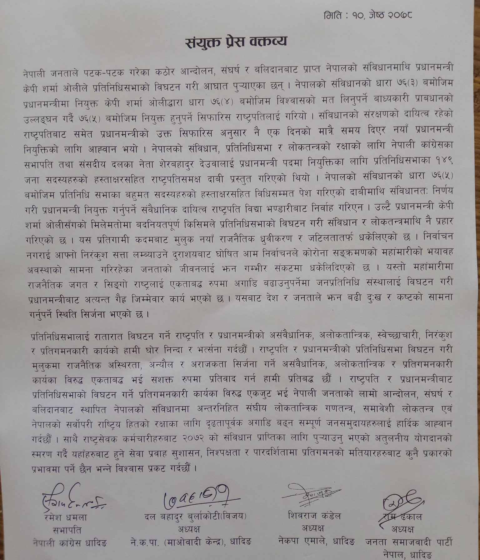बैठकपछि जारी वक्तव्यमा भनिएको छ, प्रतिनिधिसभालाई रातारात विघटन गर्ने राष्ट्रपति र प्रधानमन्त्रीको असंवैधानिक, अलोकतान्त्रिक, स्वेच्छाचारी, निरंकुश र प्रतिगमनकारी कार्यको हामी घोर निन्दा र भत्र्सना गर्दछौँ । राष्ट्रपति र प्रधानमन्त्रीको प्रतिनिधिसभा विघटन गरी मुलुकमा राजनैतिक अस्थिरता, अन्यौल र अराजकता सिर्जना गर्ने असंवैधानिक, अलोकतान्त्रिक र प्रतिगमनकारी कार्यका विरुद्ध एकताबद्ध भई सशक्त रुपमा प्रतिवाद गर्न हामी प्रतिबद्ध छौँ ।