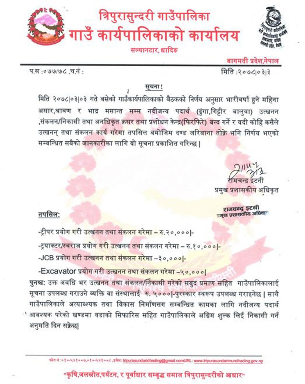 बिहिबार सूचना जारी गर्दै त्रिपुरासुन्दरी असार, साउन र भदौ महिना नदी जन्य पदार्थहरु (ढुङ्गा, गिट्टी र बालुवा) उत्खनन् संकलन निकासी तथा अनधिकृत क्रसर तथा प्रशोधन केन्द्र (फिरफिरे) बन्द गर्ने निर्णय गरेको हो ।