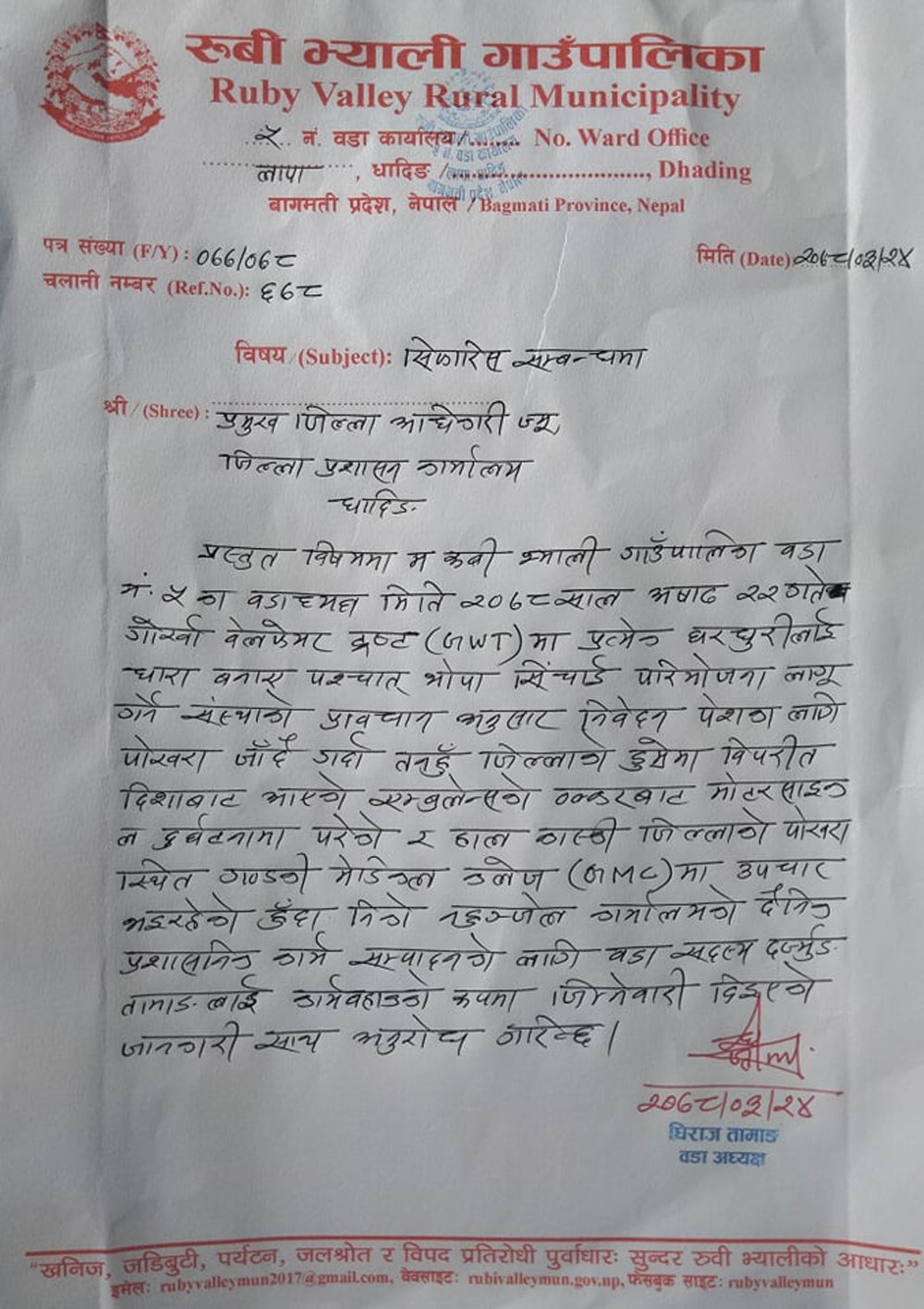 ५ का अध्यक्ष धिराज तामाङले कार्यवहाक तोकेको पत्र