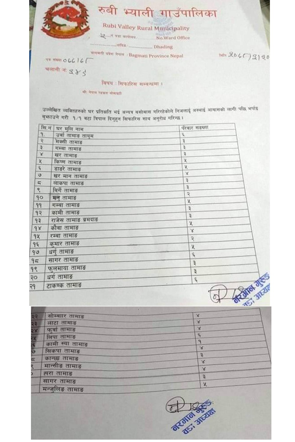 धादिङ असार ३१ । धादिङको रुवीभ्याली गाउँपालिका ६ का वडा अध्यक्ष नरमान गुरुङले वडा नम्बर ५ को समेत अध्यक्ष बनेर सिफारिस गरेको पाईएको छ ।