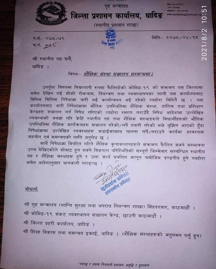 जिल्लाका सबै स्थानीय तहलाई लक्ष्यित गरि जिल्ला प्रशासनले, कोरोना रोकथामका लागि हाल निषेधाज्ञा जारी नै रहेको आवस्थामा केहि स्थानीय तह तथा शैक्षिक संस्थाहरुले भौतिक उपस्थितिमा शैक्षिक कार्यक्रमहरु संचालन गरेको भन्ने बुझिन आएको र उक्त क्रियाकलापले संक्रमण फैलन सक्ने सम्भावना भएकोले उक्त क्रियाकलाप प्रचलित कानुन बमोजिम दण्डनीय हुने आदेश गरेको छ ।