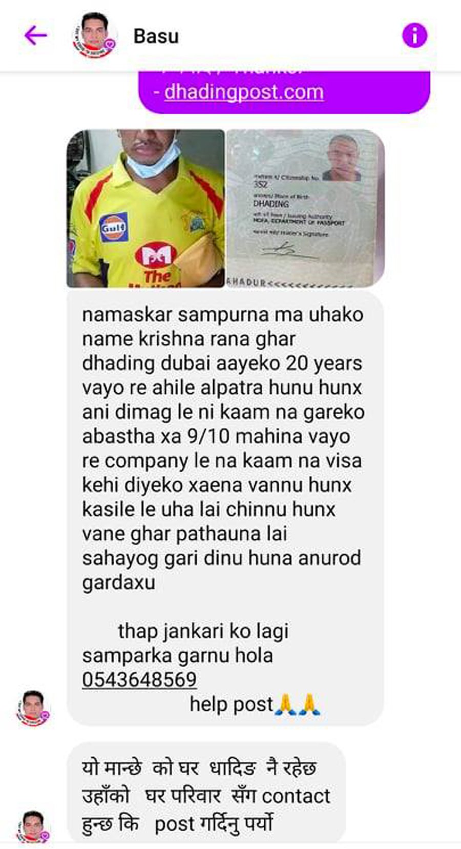 धादिङ साउन २५ । धादिङपोष्टलाई दुबईबाट बासु भट्टले धादिङका कृष्ण राना दुबईमा अलपत्र हुनुहुन्छ समाचार बनाई दिनु पर्यो भनेर म्यासेज गरे सँगै हामीले उक्त म्यासेजलाई आधार मानि दुबईमा कृष्ण राना अलपत्र भनेर समाचार लेखेका थियौं ।