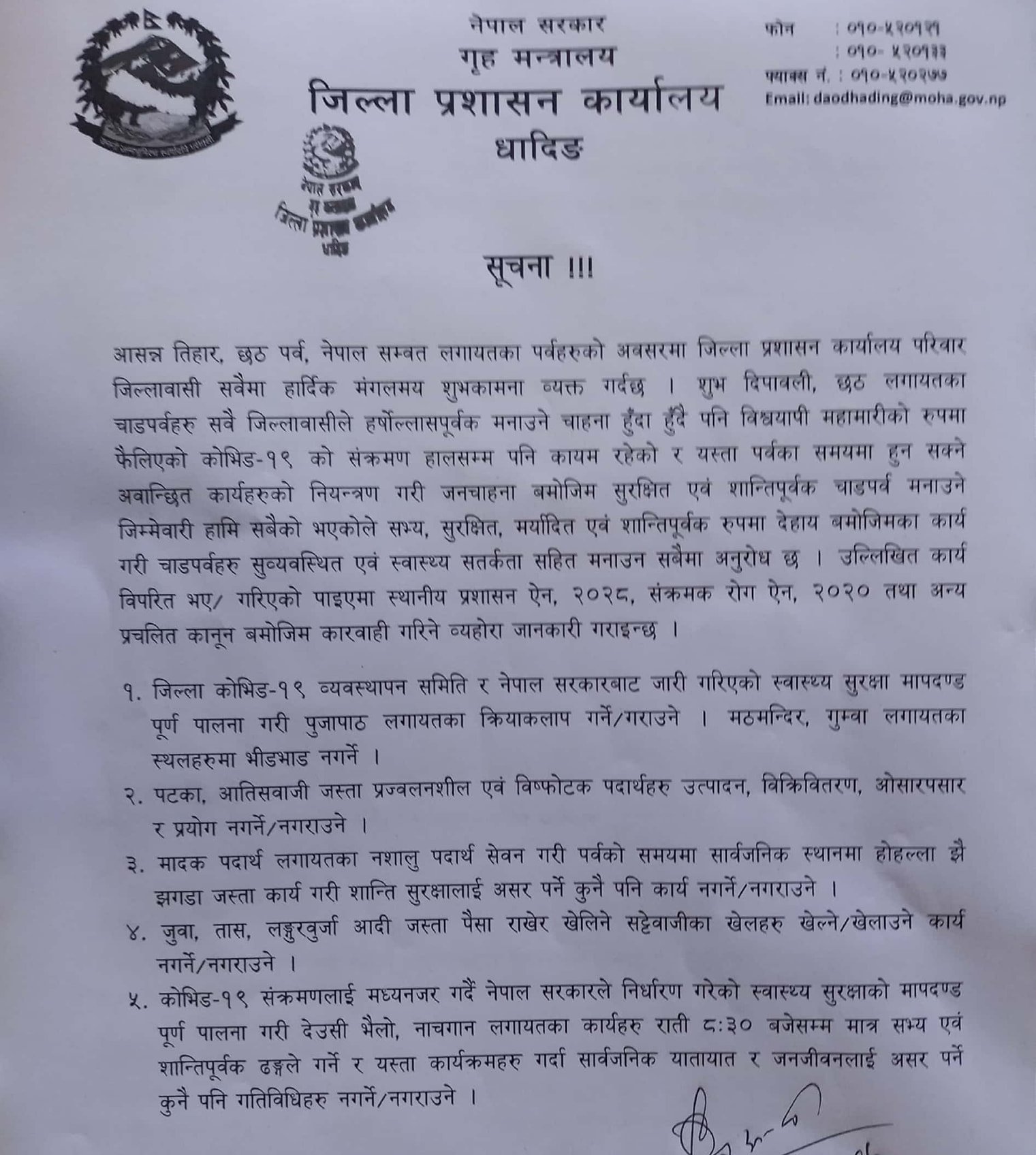 धादिङ कात्तिक १७ । जिल्ला प्रशासन कार्यालय धादिङले सूचना जारी गर्दै तिहारमा बेलुका साढें ८ बजे सम्म मात्रै देउसी भैलो खेल्न पाईने जनाएको छ । प्रशाशनले आज एक सूचना जारी गर्दै कोभिड १९ संक्रमणलाई मध्यनजर गदै सरकारले निर्धारण गरेको सुरक्षा मापदण्ड पूर्ण पालना गरी देउसी भैलो, नाचगान लगायतका कार्यहरु राती ८ः३० बजे सम्म मात्रै सभ्य एवं शान्तिपूर्ण ढंगले गर्ने र यस्ता कार्यक्रमहरु गर्दा सार्वजनिक यातायात र जनजीवनलाई असर गर्न नपाईने जनाएको हो ।