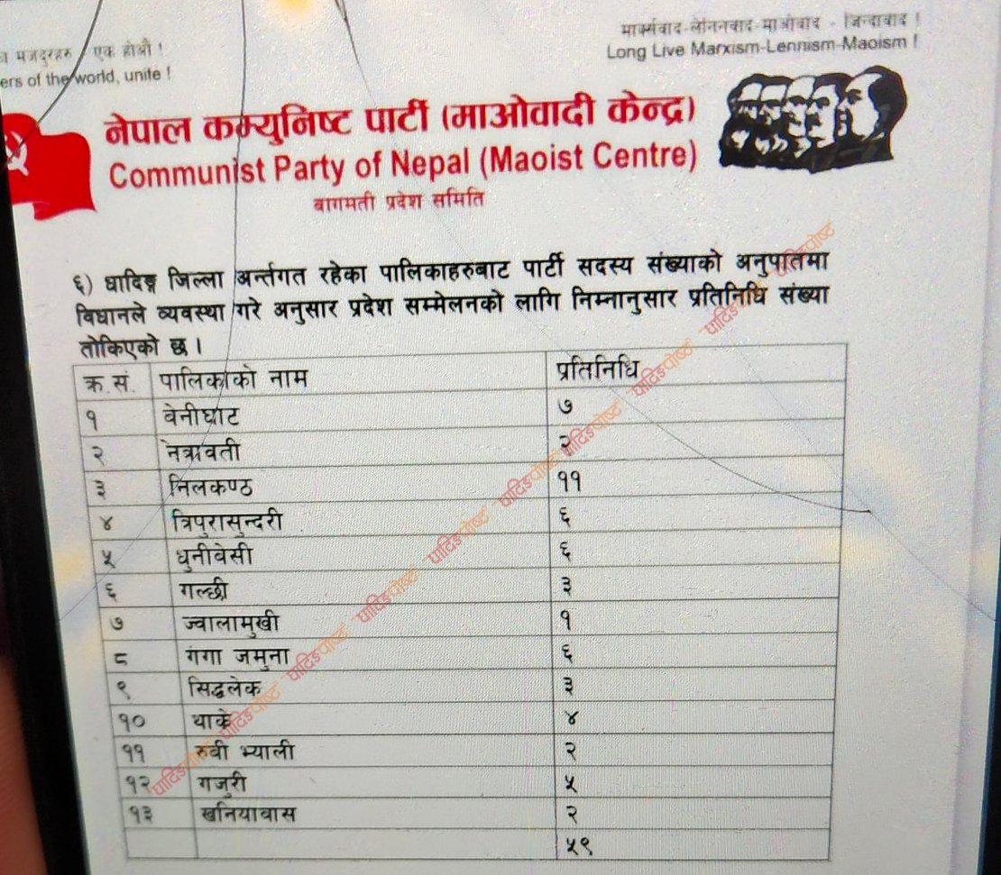 धादिङ मंसिर २२ । नेकपा (माओवादी केन्द्र) को मंसिर २५ गते सबै प्रदेशको प्रदेश सम्मेलन एकैपटक हुँदैछ । यस प्रदेश सम्मेलनका लागि धादिङका १३ वटा स्थानीय तहबाट ५९ जना प्रतिनीधिहरु छनोट भएको माओवादी केन्द्र धादिङले जनाएको छ ।
