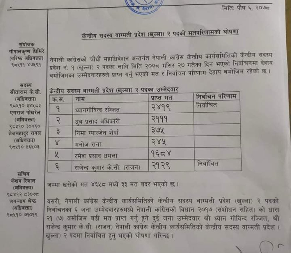 बागमती प्रदेशतर्फ खुला केन्द्रीय सदस्यमा निर्वाचित हुनेहरुमा ध्यानगोविन्द रन्जित र राजन केसी रहेका छन् । यस्तै, प्रदेशको महिलातर्फ उर्मिला नेपाल विजयी भईन। ध्यानगोबिन्द र उर्मिला देउवा पक्ष हुन् । ध्यानगोविन्द रन्जितले २४१९ मत र राजन केसी २१२९ मत ल्याई विजयी हुँदा धादिङ रमेश धमलाले १६८४ मत ल्याएका थिए ।