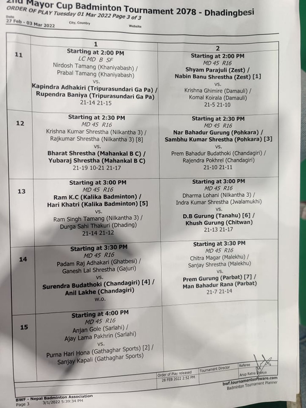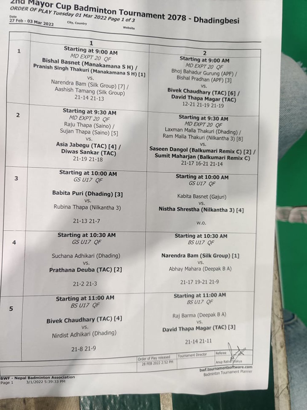 जिल्ला स्तरीय तर्फ, पुरुष एकल, महिला एकल र पुरुष युगलका खेलहरु, राष्ट्रिय स्तरमा अण्डर १७ केटी र केटी, ४५ प्लस पुरुष युगल, ५५ प्लस पुरुष युगल, खुल्ला पुरुष युगल (र्याङ्किङ टप २० सम्मलेभाग लिन नपाउने) लगायतका खेलहरु जारि छन् । अधिकांश खेलहरुको सेमि फाईनल र फाईनल भोली फागुन १९ गते हुने र बाँकी रहेको खेलहरुको फाईनल १९ गते हुने आयोजकले जनाएको छ ।