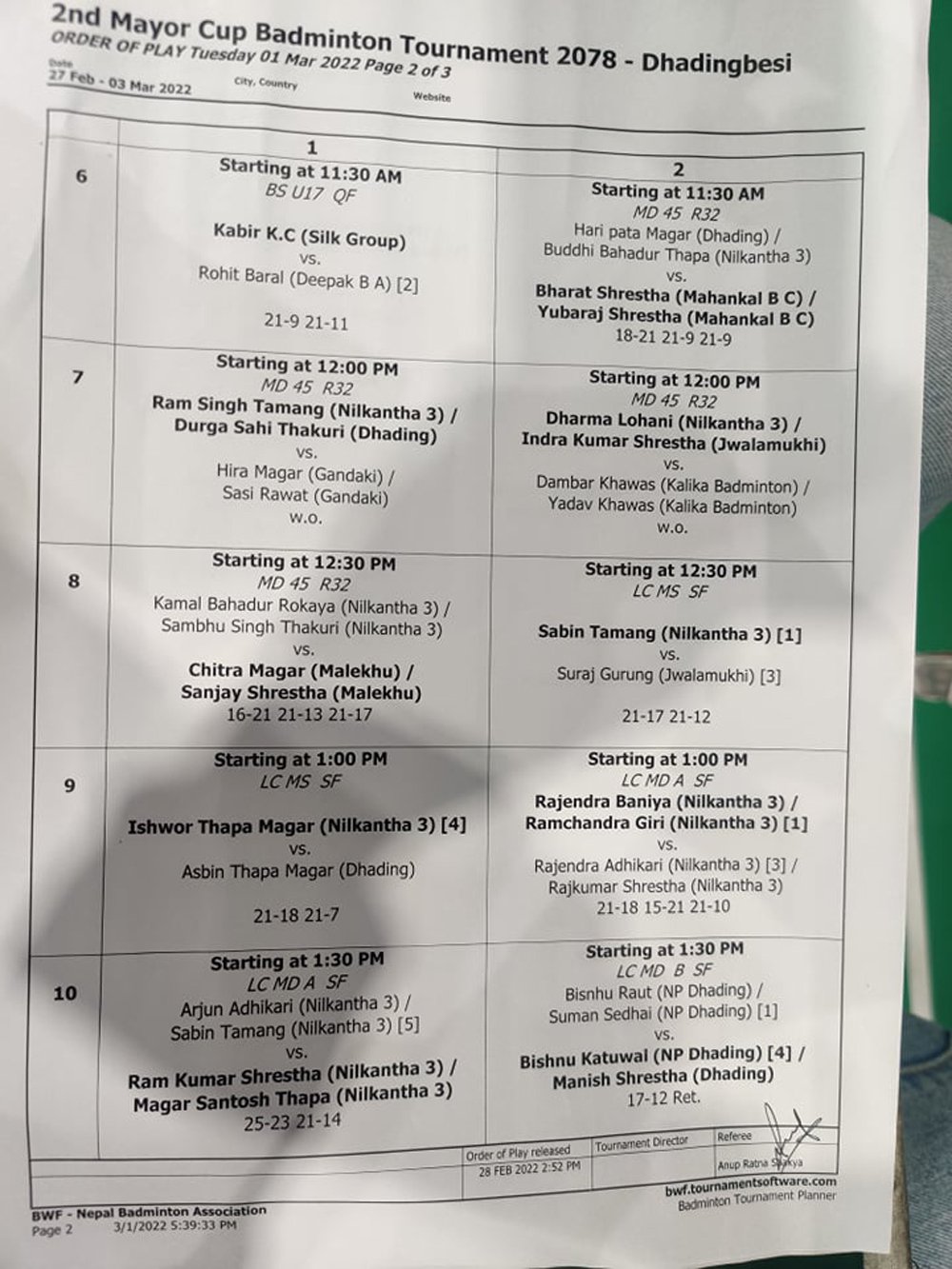 आज भएको सेमी फाईनलमा राजकुमार श्रेष्ठ र राजेन्द्र अधिकारीको जोडीको जोडीलाई पराजित गर्दै रामचन्द्र गिरी र राजेन्द्र बानियाँको जोडी फाईनल प्रवेस गरेको हो भने सविन तामाङ र अर्जुन अधिकारीको जोडीलाई हराउँदै सन्तोष थापामगर, रामकुमार श्रेष्ठको जोडी फाईनल पुगेको हो ।