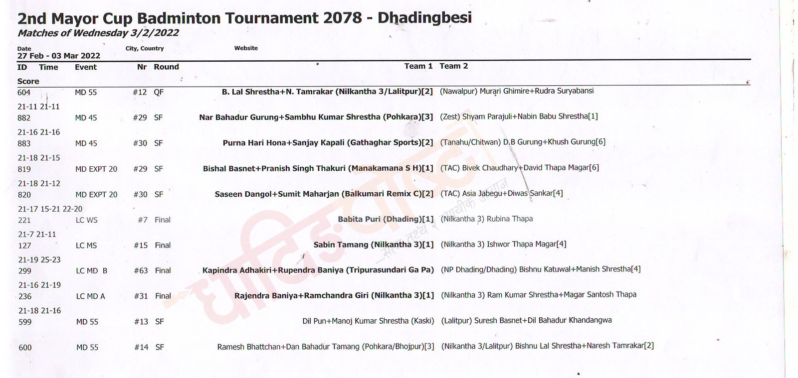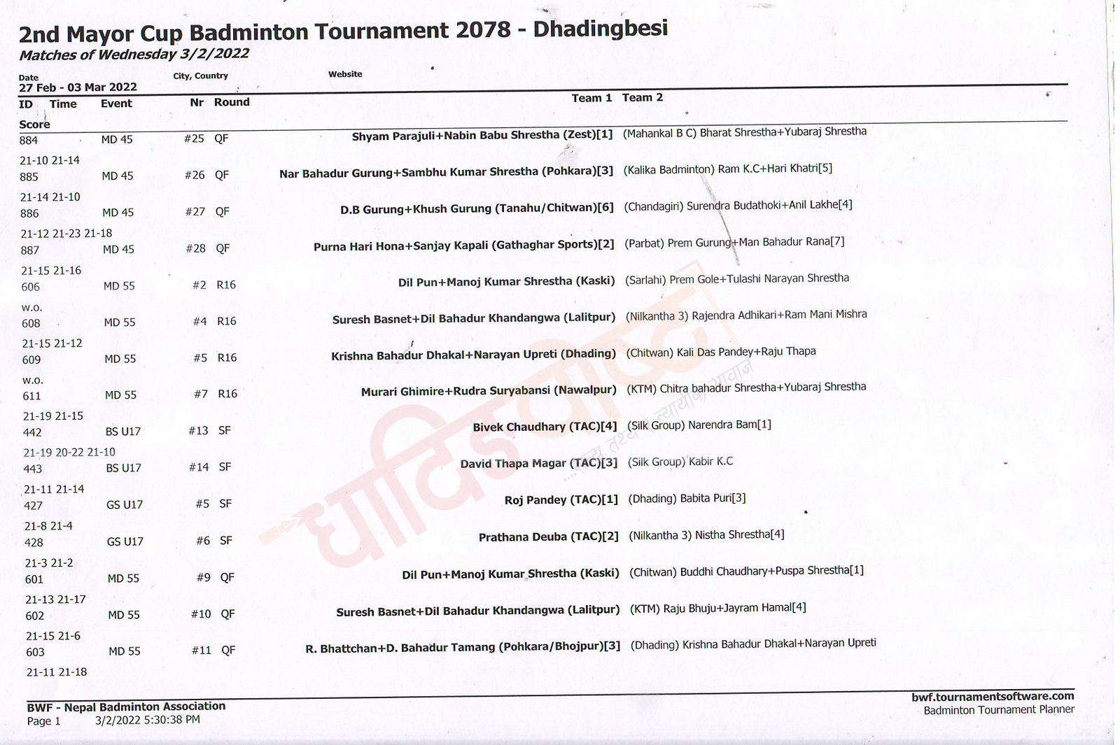 धादिङ । धादिङ जिल्ला ब्याडमिण्टन संघले धादिङबेसी स्थित आफ्नै नव निर्मित कभर्डहलमा फागुन १५ गतेबाट आयोजना गरेको दोस्रो मेयरकप २०७८ को जिल्ला तर्फको सबै फार्यनलहरु आज सम्पन्न भएको छ भने । राष्ट्रिय तर्फको ५ वटा खेलहरुको फाईलन भोली बिहान ८ बजेबाट सुरुहुने भएको छ ।