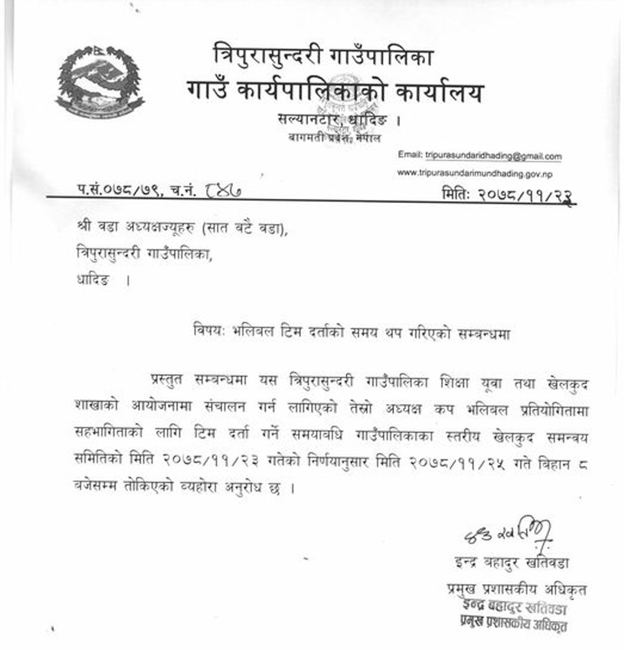 धादिङ । धादिङको त्रीपुरासुन्दरी गाउँपालिकाको शिक्षा युवा तथा खेलकुद शाखाले यहि फागुन २५ र २६ गते तेस्रो अध्यक्ष कप भलिबल प्रतियोगिताको आयोजना गर्ने भएको छ ।