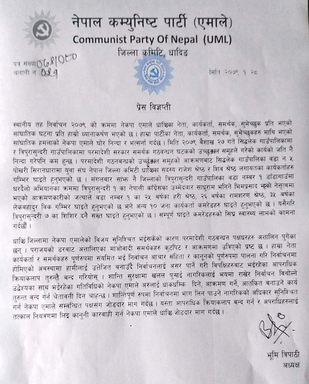 एमाले धादिङका अध्यक्ष भुमि त्रिपाठीले एक विज्ञप्ती जारी गर्दै बैशाख २७ गते सिद्धलेक गाउँपालिकामा र त्रिपुरासुन्दरी गाउँपालिकामा गठवन्धन घटकको उच्छृङखल समूहले भौतिक आक्रमण गर्दा आफ्ना कार्यकर्ताहरु घाईते भएको जनाएका छन् ।