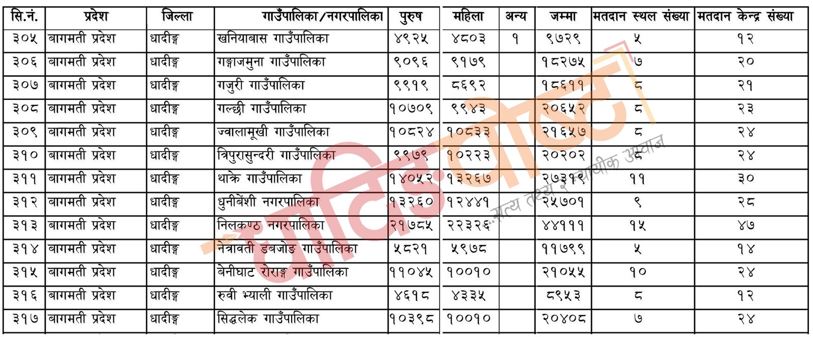 धादिङमा सबैभन्दा धेरै मतदाता नीललकण्ठ नगरपालिकामा २२,३२६ महिला र २१,७८५ पुरुष गरी ४४,१११ जना रहेका छन् भने सबै भन्दा कम मतदाता रुवीभ्याली गाउँपालिकामा ४,३३५ महिला र ४,६१८ पुरुष गरि ८,९५३ जना छन् ।