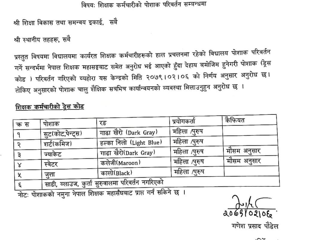 नेपाल शिक्षक महासंघले समेत पोशाक परिवर्त गर्न अनुरोध गरेको जनाउँदै मन्त्रालयले सु (कोट, पेन्ट्स) को रङ गाढा खैरो, शर्ट (कमिज) हल्का निलो, ज्याकेट गाढा खैरो, स्वेटर कलेजी, जुत्ता कालो कायम गरिएको जनाएको छ भने साडी ब्लाउज, कुर्ता सुरुवाल परिवर्तन नगरिएको जनाएको छ ।