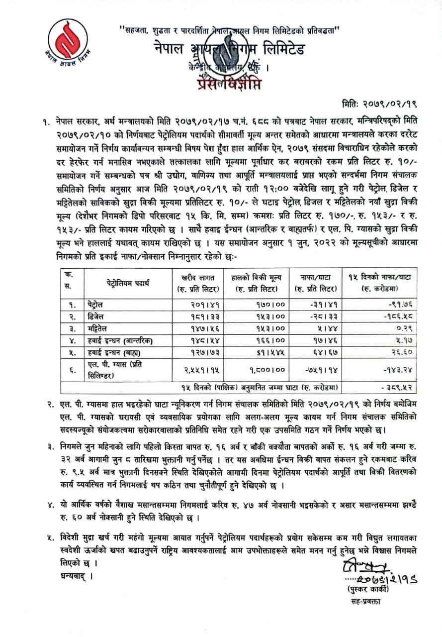सरकारले पेट्रोल, डिजेल र मटितेलको मूल्य घटाएको छ। नेपाल आयल निगमले बिहीबार मध्यराति १२ बजेबाट लागू हुने गरी पेट्रोल, डिजेल र मटितेलको मूल्य प्रतिलिटर १० रूपैयाँका दरले घटाएको हो। अब पेट्रोलको मूल्य प्रतिलिटर १७० रुपैयाँ र डिजल तथा मट्टीतेलको मूल्य १५३ रुपैयाँ पर्नेछ ।