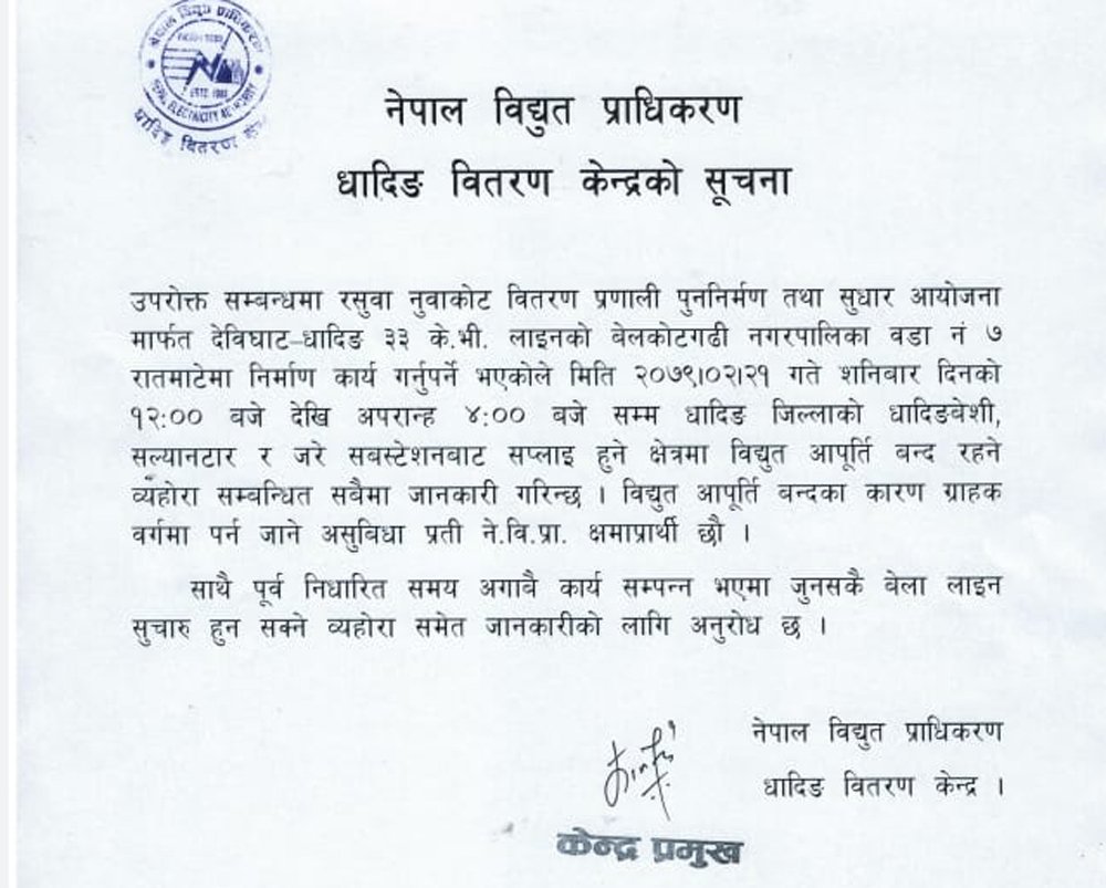 देविघाट धादिङ ३३ केभी प्रसारण लाईन नुवाकोटको रातमाटेमा मर्मत गर्नु पर्ने हुँदा दिउँसो १२ बजे देखि बेलुका ४ बजे सम्म विद्युत आपूर्ति सेवा बन्द हुने प्राधिकरणले जनाएको हो ।