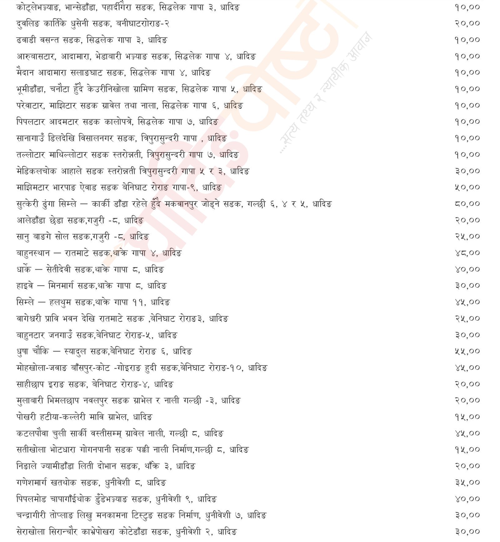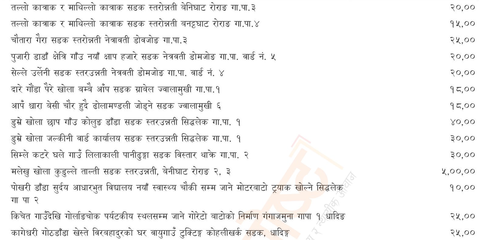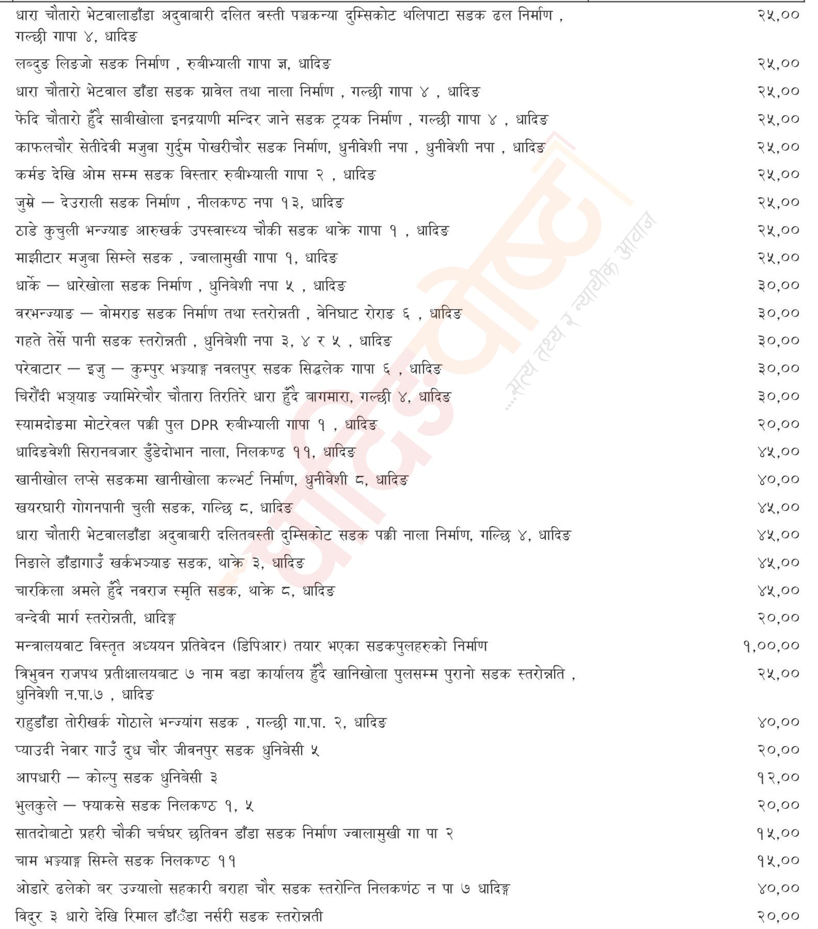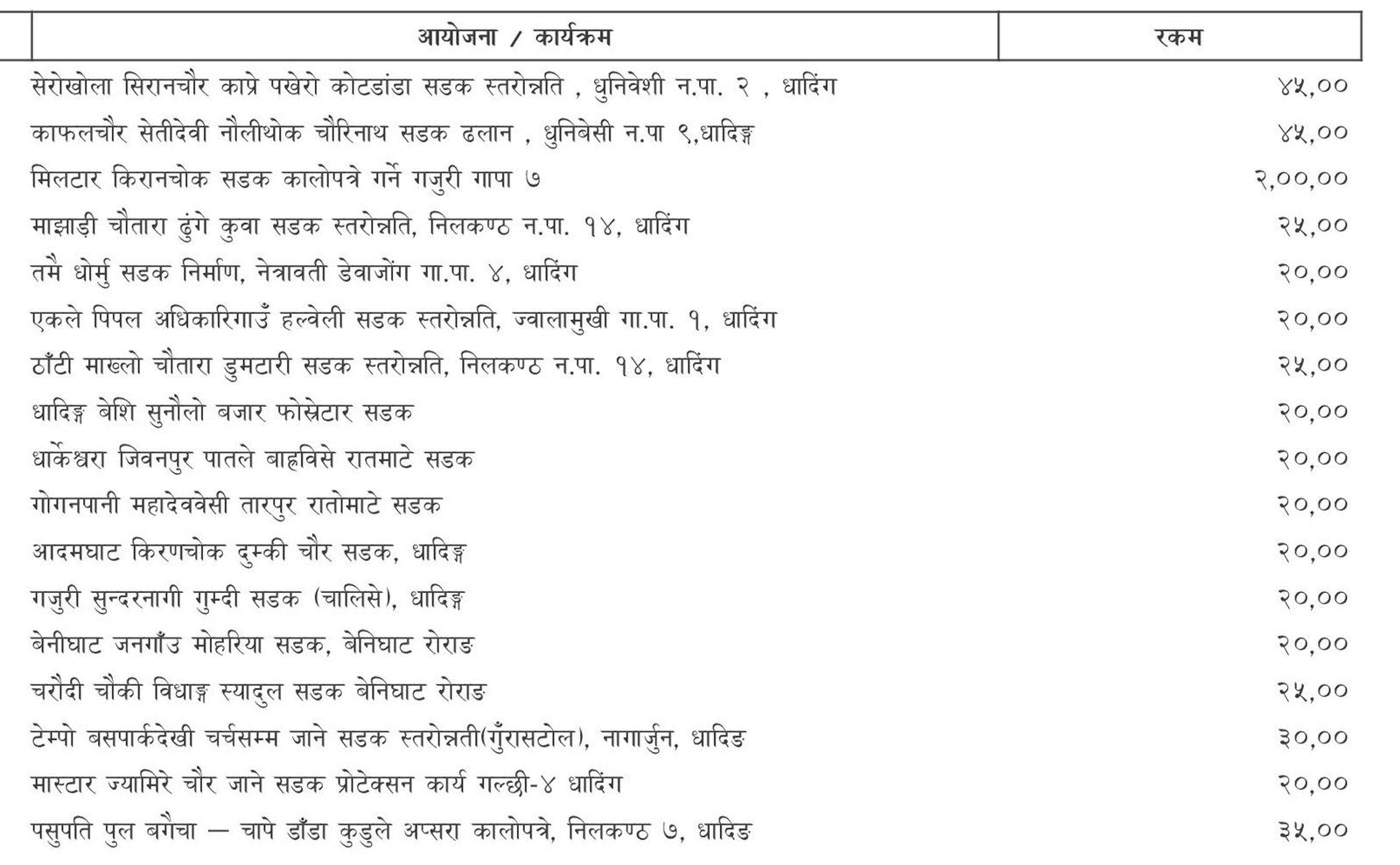 स्तो छ धादिङका लागि भौतिकपूर्वाधार तर्फ विनियोजन गरेको बजेटको सूची