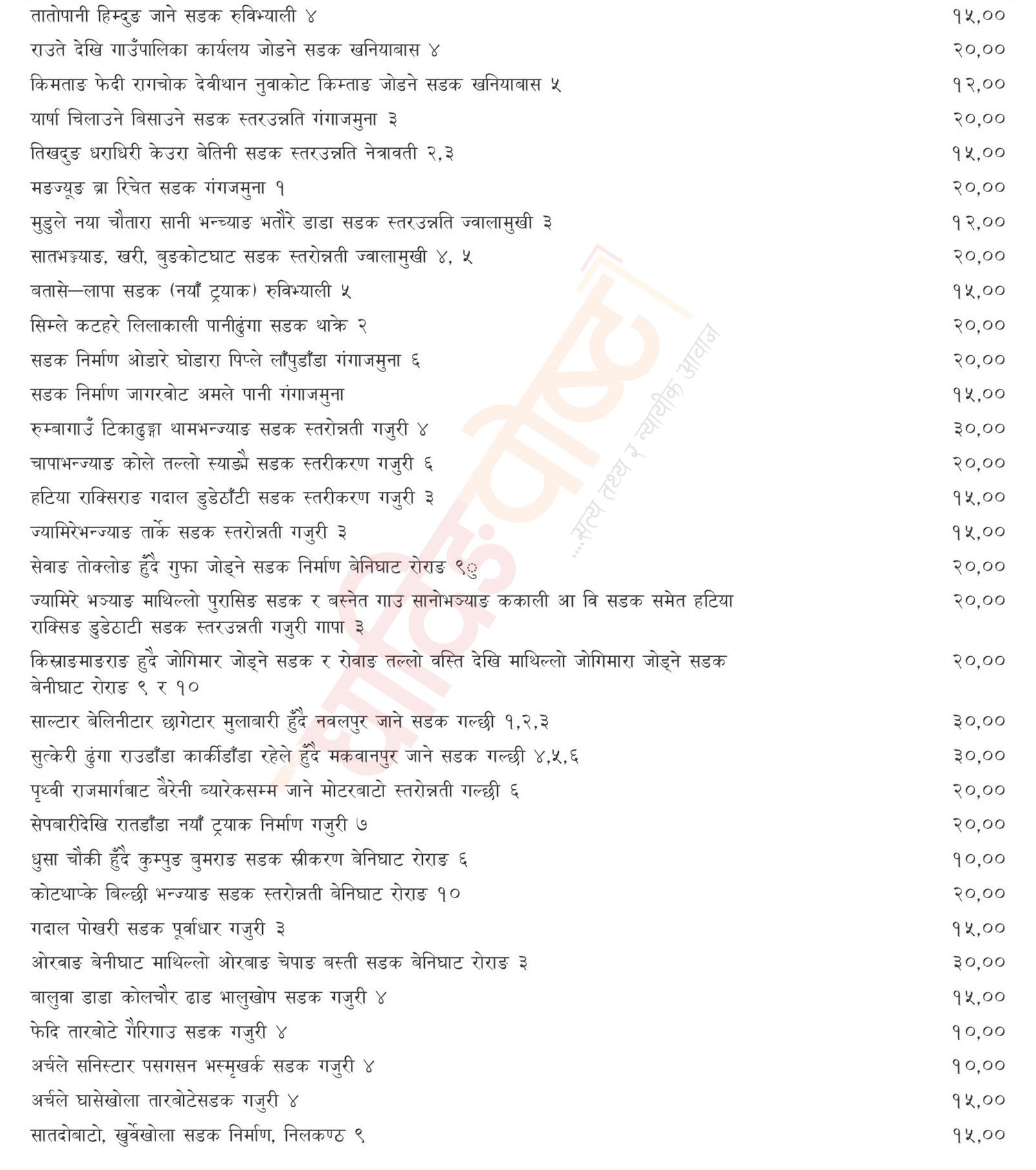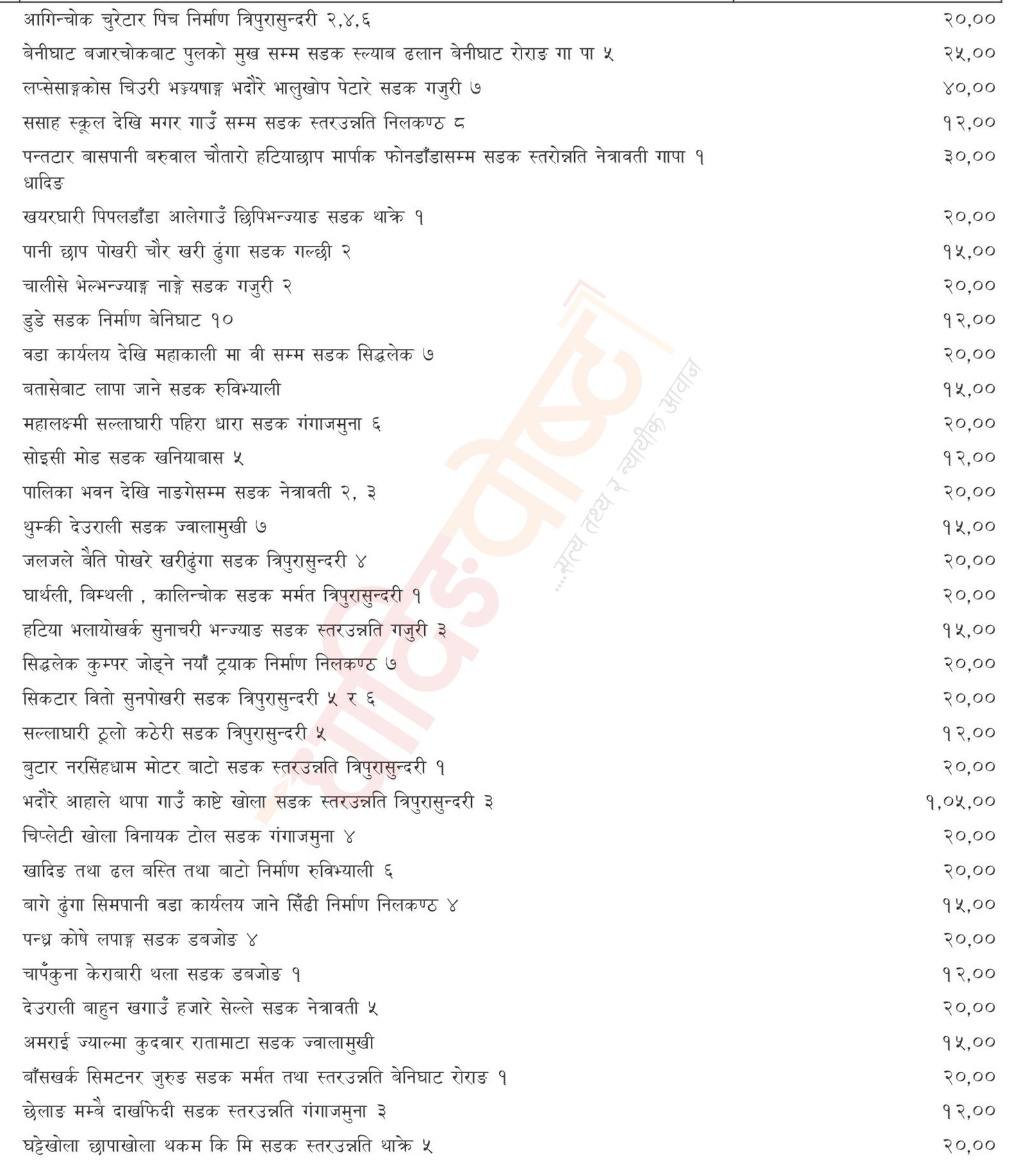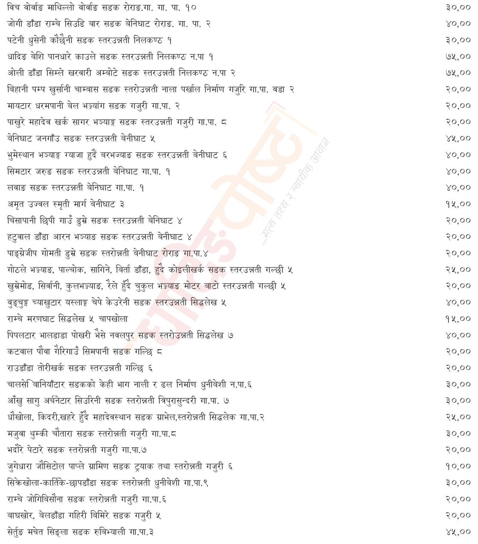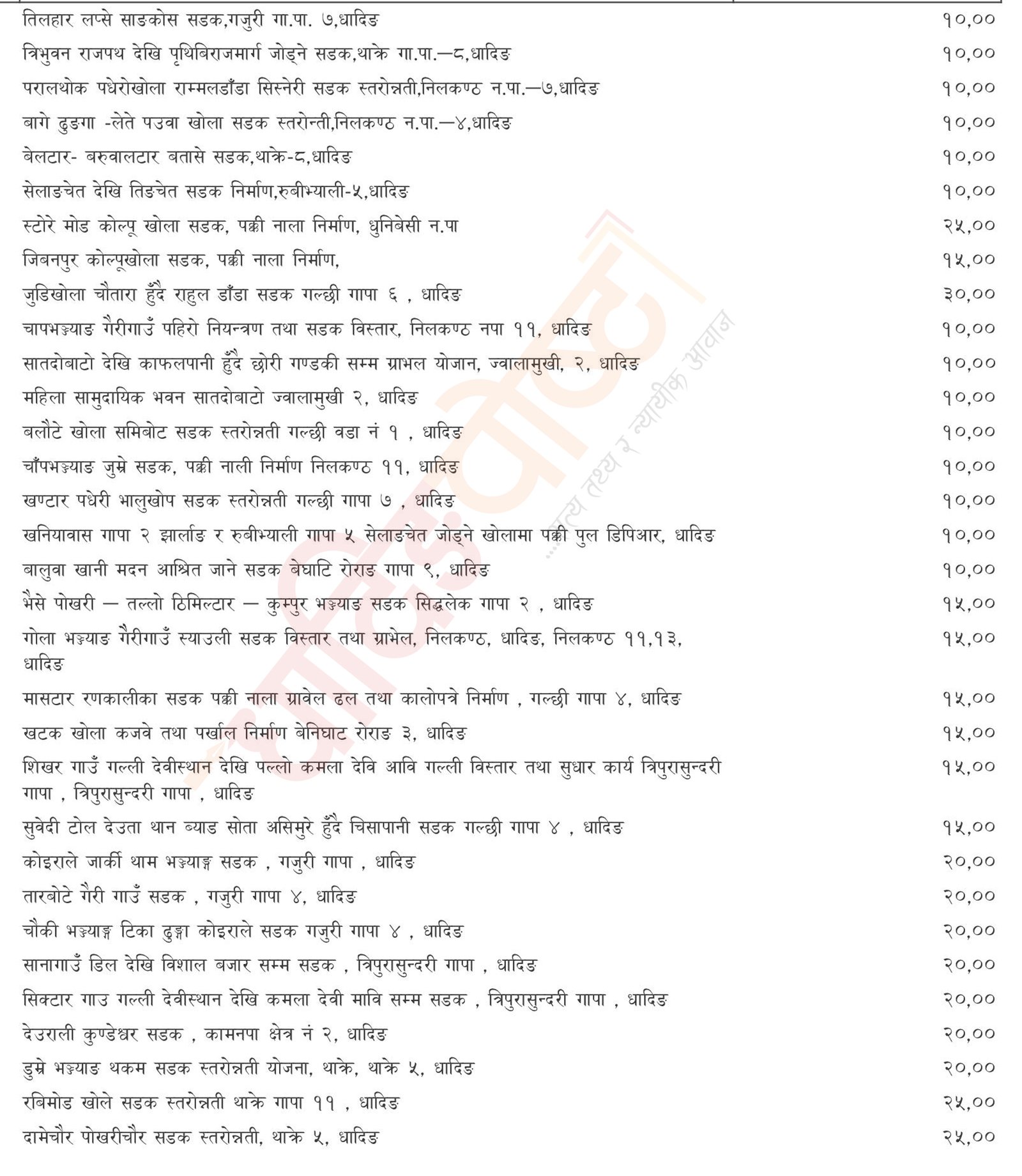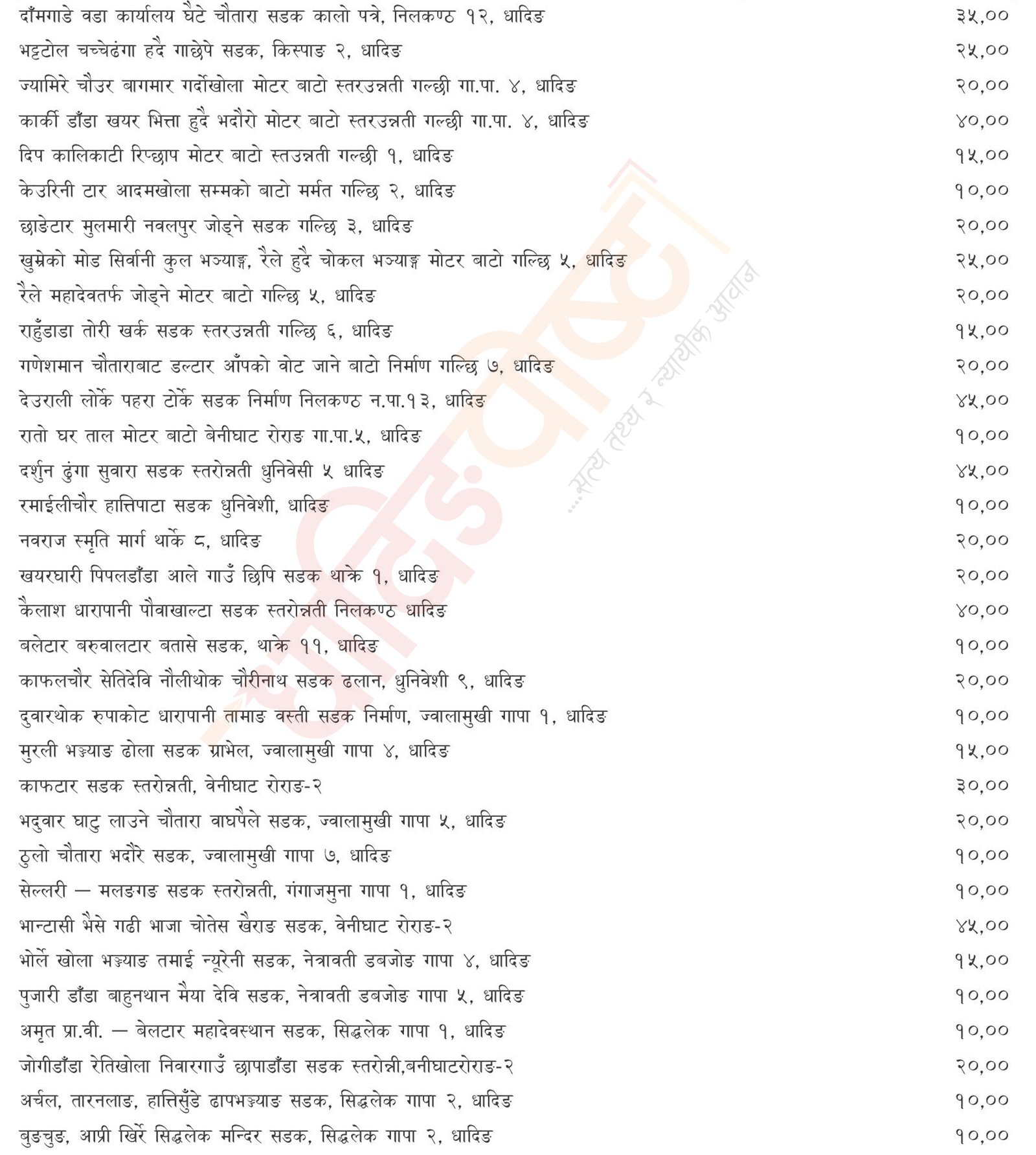 स्तो छ धादिङका लागि भौतिकपूर्वाधार तर्फ विनियोजन गरेको बजेटको सूची