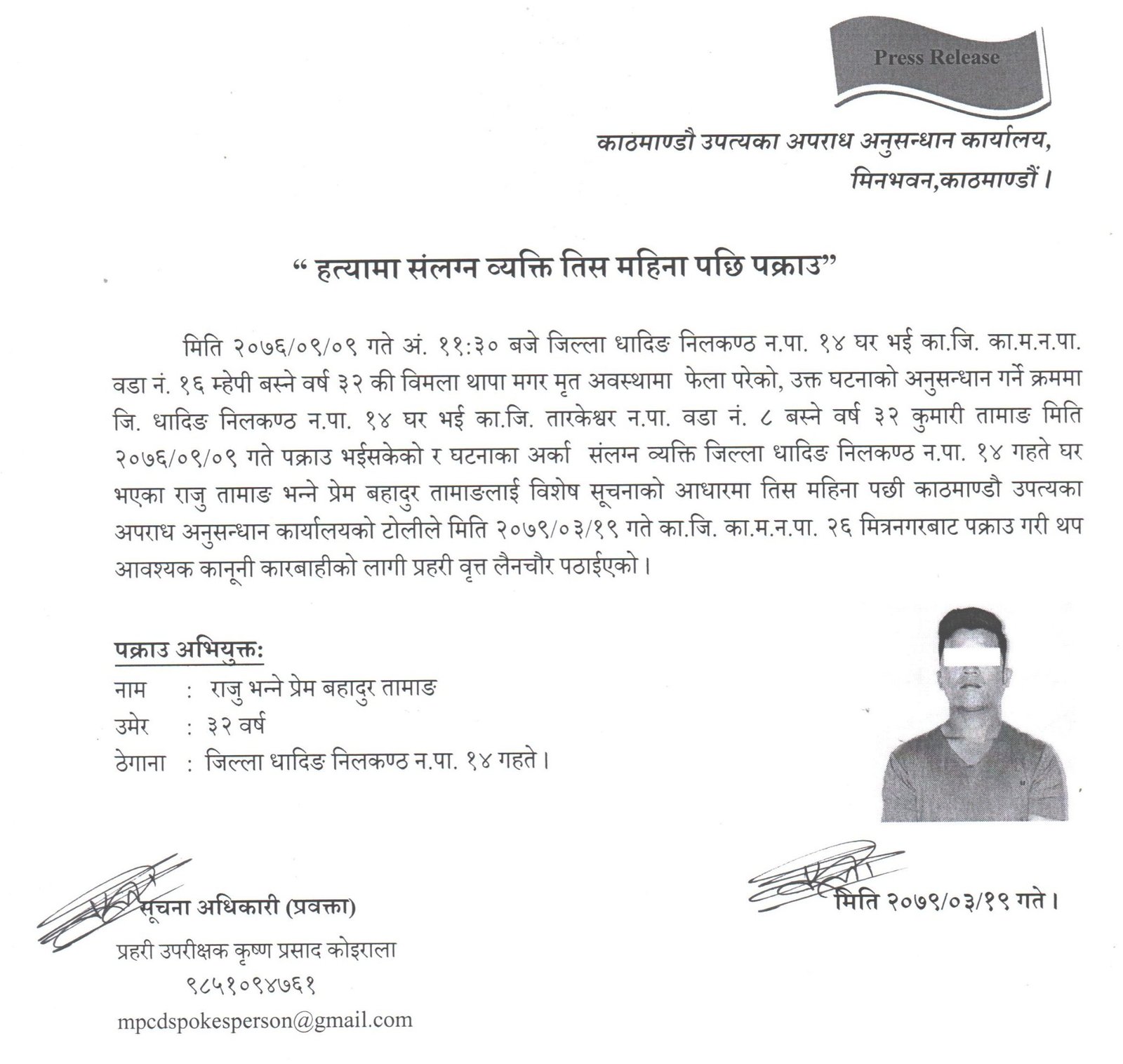 उक्त घटनामा अनुसन्धान गर्ने क्रममा नीलकण्ठ १४ घर भई तारकेश्वर बस्ने कुमारी तामाङ पक्राउ भईसकेको र उक्त घटनामा राजु पनि संलग्न देखिएकोले ३० महिना पछि पक्राउ गरिएको प्रहरीले जनाएको छ ।