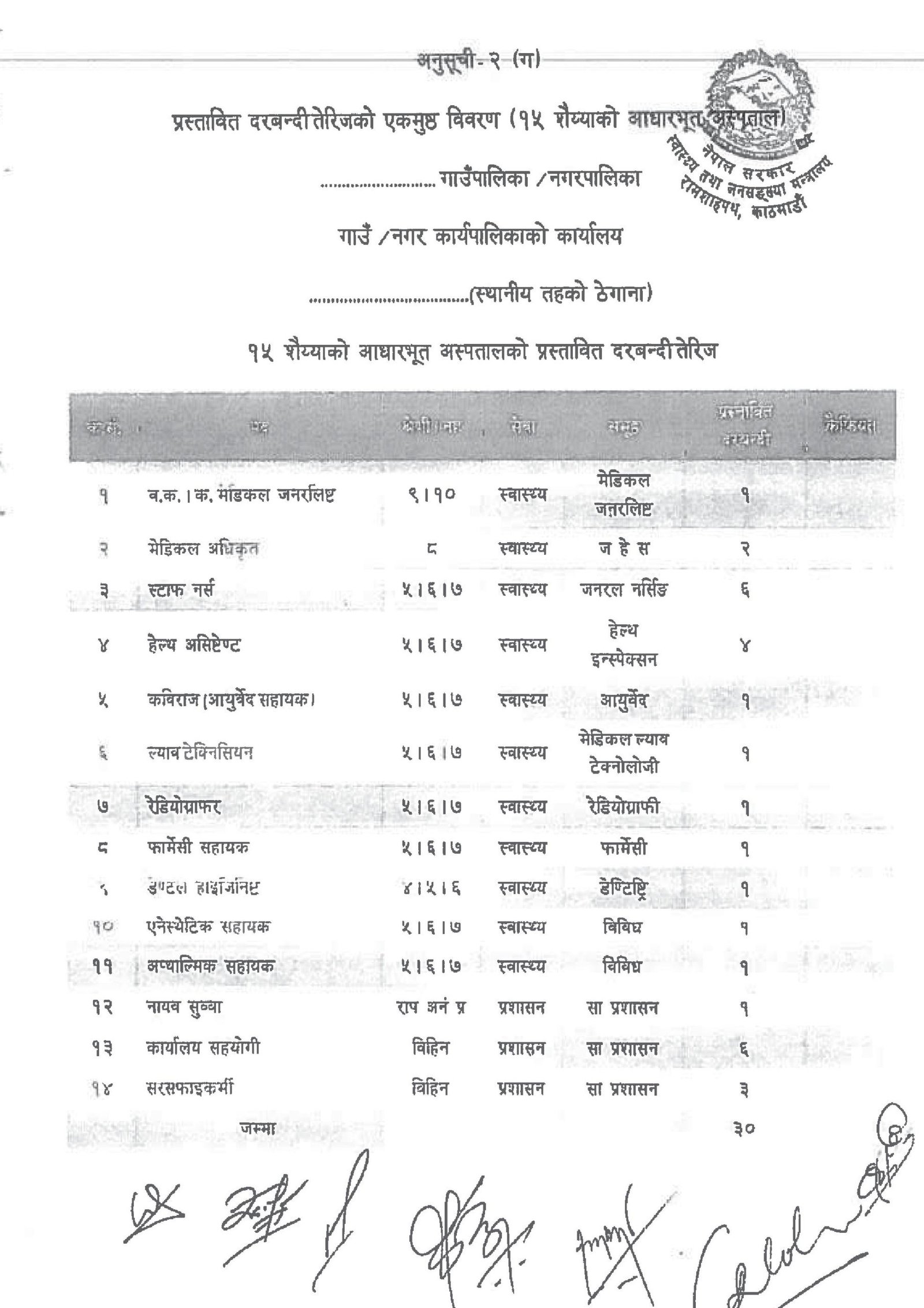 उक्त पत्रमा जनाए अनुसार धादिङको गल्छी गाउँपालिकामा १५ शैया र बेनीघाट रोराङमा १० शैयाको आधारभुत अस्पतालका लागि संगठनात्मक संरचना र दरवन्दी स्वीकृत गरिएको दरवन्दी विवरण पठाएको छ ।