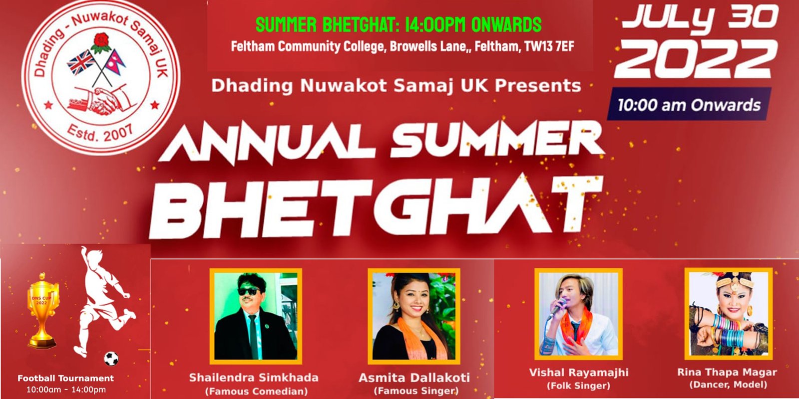 युकेबाट हामीलाई धन तामाङले जानकारी दिए अनुसार, उक्त दिन समाजको आयोजनामा हुने फुटबल कार्यक्रम पछि वरिष्ठ राष्ट्रिय हास्य कलाकार शैलेन्द्र सिम्खदा, लोक दोहोरी गायक नक्कले भेना (बिशाल रायमाझी) र दोहोरी गायिका अस्मिता डल्लाकोटि, चर्चित मोडेल तथा डान्सर रिना थापा मगर, स्थानीय कलाकार र भान्जा भान्जी साथै बिशाल मोक्तान DJ को प्रस्तुती रहने छ ।