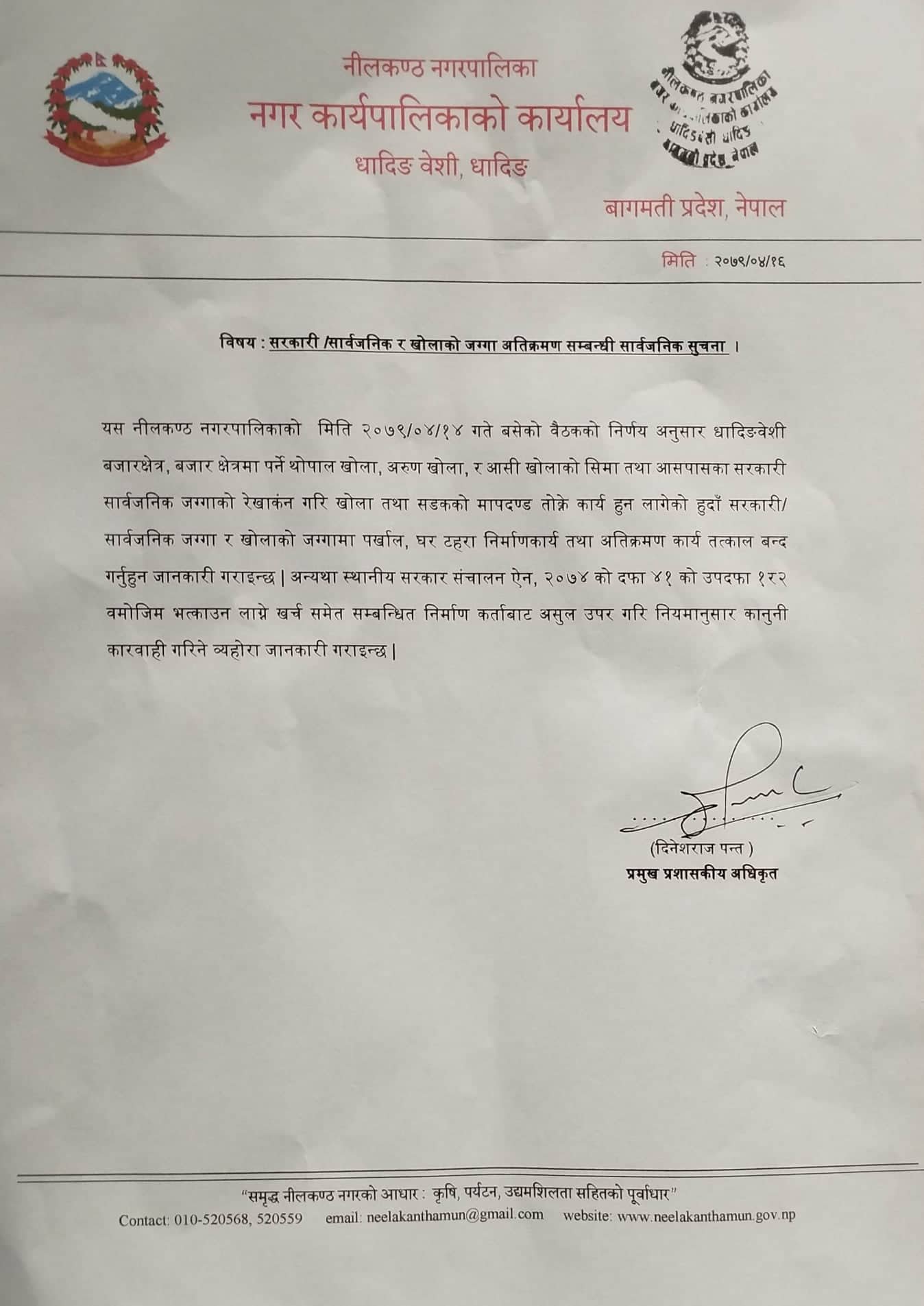 सूचनामा भनिएको छ, स नीलकण्ठ नगरपालिकाको मिति २०७९/०४/१४ गते बसेको बैठकको निर्णय अनुसार धादिङबेशी बजारक्षेत्र, बजार क्षेत्रमा पर्ने थोपाल खोला, अरुण खोला र आसी खोलाको सिमा तथा आसपासका सरकारी, सार्वजनिक जग्गाको रेखाकंन गरि खोला तथा सडकको मापदण्ड तोक्ने कार्य हुन लागेको हुदाँ सरकारी र सार्वजनिक जग्गा र खोलाको जग्गामा पर्खाल, घर टहरा निर्माण कार्य तथा अतिक्रमण कार्य तत्काल बन्द गर्नुहुन जानकारी गराइन्छ ।