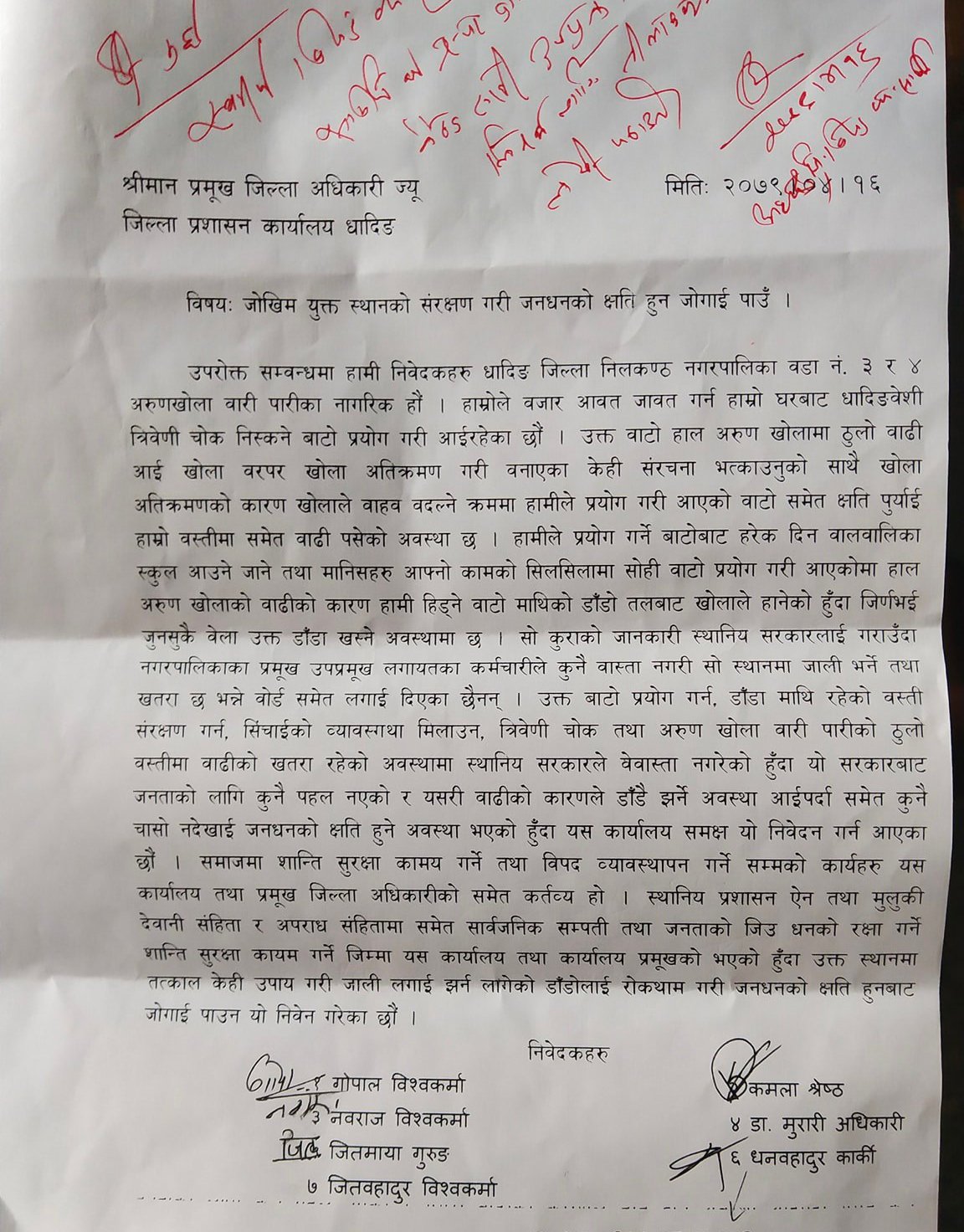 धादिङ । स्थानीय गोपाल विश्वकर्मा सहित ७ जनाले सोमबार जोखिम युक्त स्थानको संरक्षण गरि जनधनको हुन जोगाई दिन भन्दै सोमबार जिल्ला प्रशासनमा निवेदन दिए र उक्त निवेदन बमोजिमको माग सम्बोधन गरिदिन भन्दै प्रशासनले नीलकण्ठ नगरपालिकालाई पत्रचार गरेको छ ।