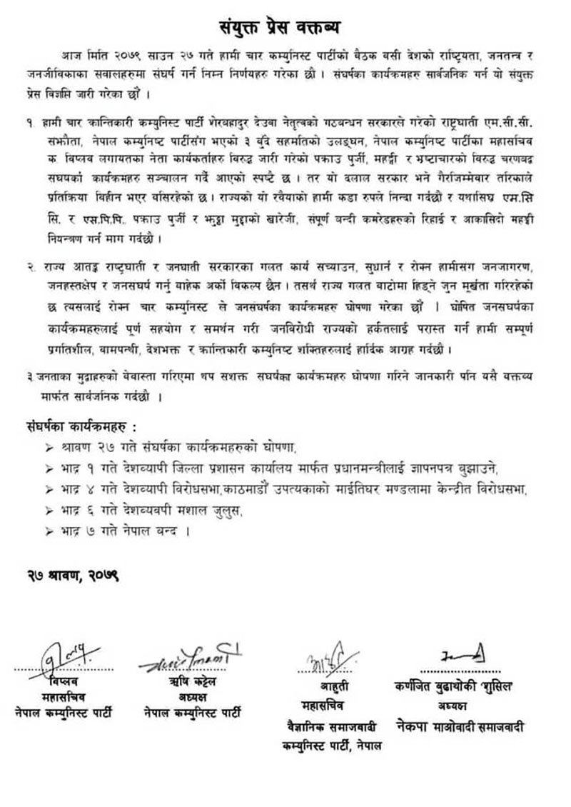 काठमाडौं । नेपाल कम्युनिष्ट पार्टीका महासचिव विप्लव, नेपाल कम्युनिष्ट पार्टीका अध्यक्ष ऋषि कट्टेल, वैज्ञानिक समाजवादी कम्युनिष्ट पार्टीका महासचिव आहुति र नेपाल माओवादी समाजवादीका अध्यक्ष कणजीत बुढाथोकीले संयुक्त विज्ञप्ति प्रकाशित गर्दैै भदौ ७ गते नेपाल बन्दको घोषणा गरेका हुन् ।