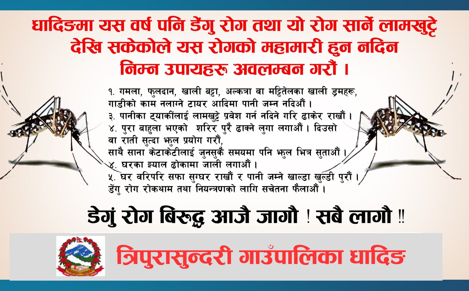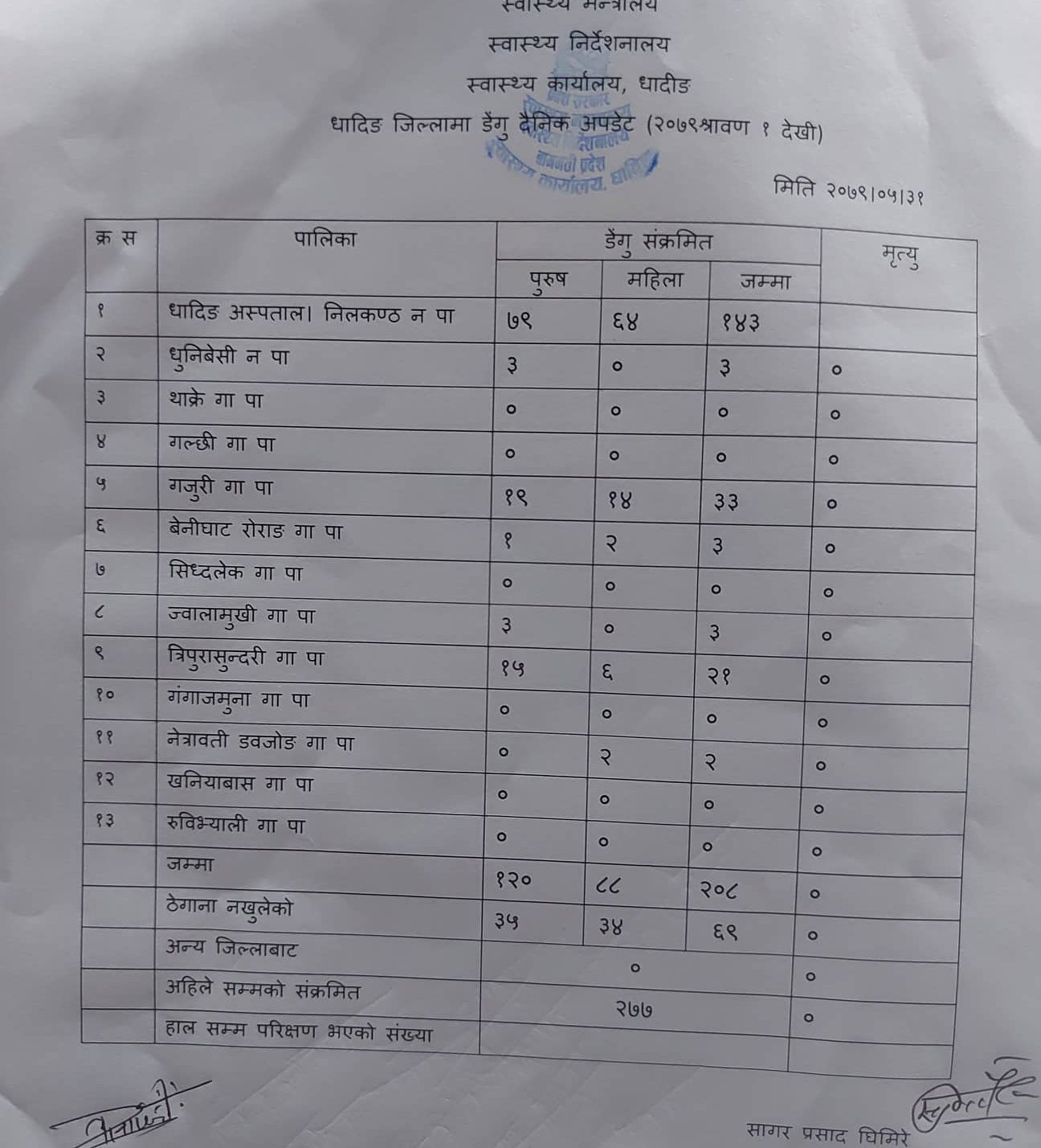 यस्तै धुनीबेसीमा ३ पुरुष, गजुरीमा १९ पुरुष र १४ महिला, बेनीघाट रोराङमा १ पुरुष र २ महिला, जवालमुखीमा ३ पुरुष, त्रिपुरासुन्दरीमा १५ पुरुष र ६ महिला, नेत्रावती डवजोङमा २ महिला र ठेगाना नखुलेका ३५ पुरुष र ३४ महिला धादिङमा यहि साउन यता डेंगु संक्रमित बनेका छन् ।