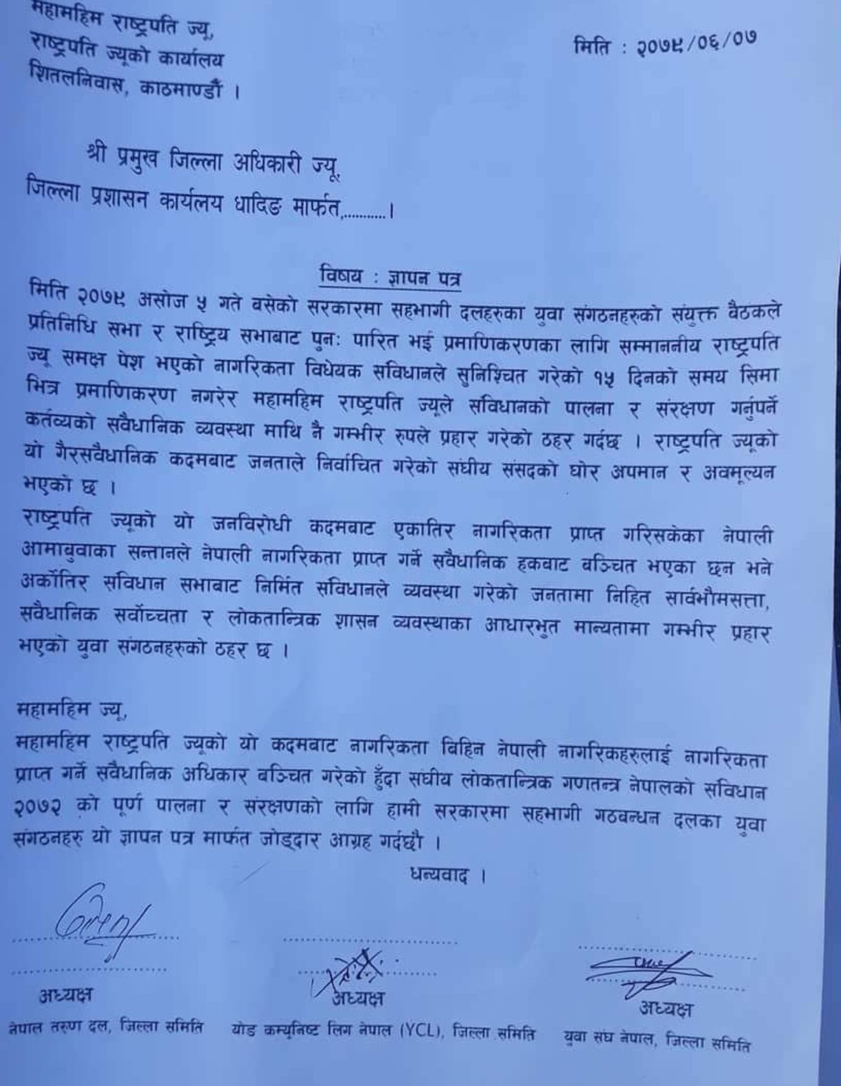राष्ट्रपतिले नागरिकता विधेयक प्रमाणिकरण नगरि संविधान उल्लङ्घन गरेकोले आन्दोलन स्वरुप ज्ञापन पत्र बुझाईएको वाईसीएल धादिङका इन्चार्ज सन्तोष डल्लाकोटीले धादिङपोष्टलाई बताए ।