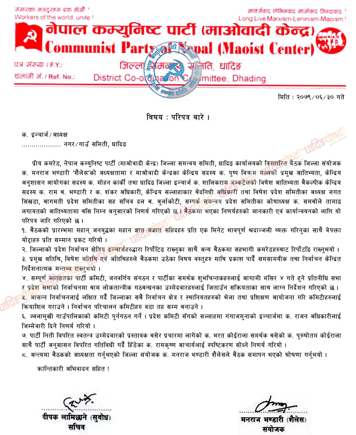 माओवादी केन्द्रका केन्द्रिय सदस्य पुष्पविक्रम मल्लको प्रमुख आतिथ्यता र जिल्ला संयोजक मनराज भण्डारी (शैलेस) को अध्यक्षतामा बसेको उक्त बैठकले आशन्न निर्वाचनको प्रचार प्रसारलाई व्यापकता बनाउन जिल्ला संघ, प्रदेश, पालिका हुँदै वडा सम्म निर्वाचन परिचालन कमिटि गठन गर्ने निर्णय समेत गरेको छ ।
