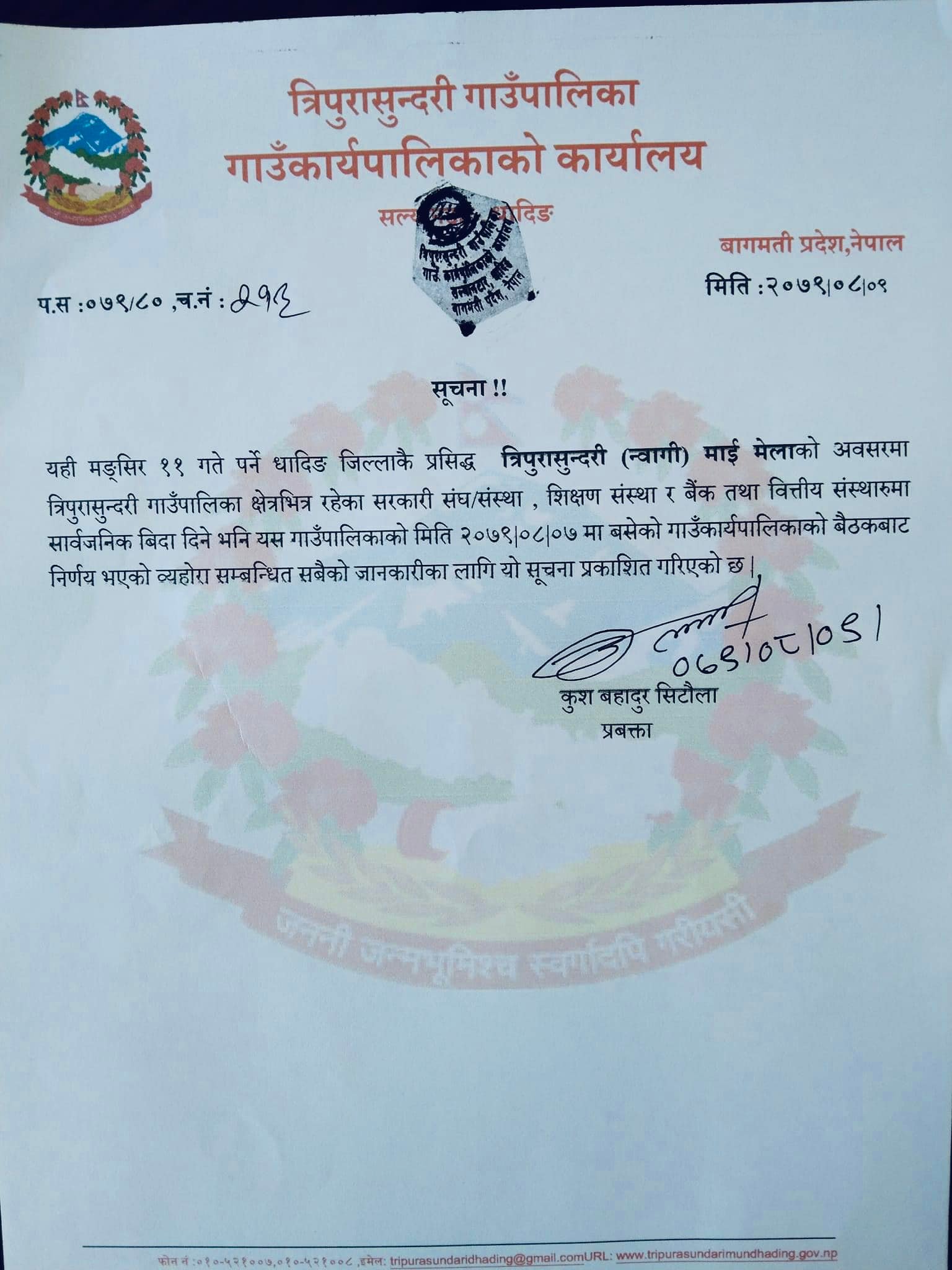 धादिङ । धादिङको ऐतिहासिक धार्मिक पर्व त्रिपुरासुन्दरी माईको मन्दिरमा लाग्ने न्वागी मेला अर्थात सल्यानबेसी जात्राको अवसरमा त्रिपुरासुन्दरी गाउँपालिकाले मंसिर ११ गते सार्वजनिक विदा दिने निर्णय गरेको छ ।