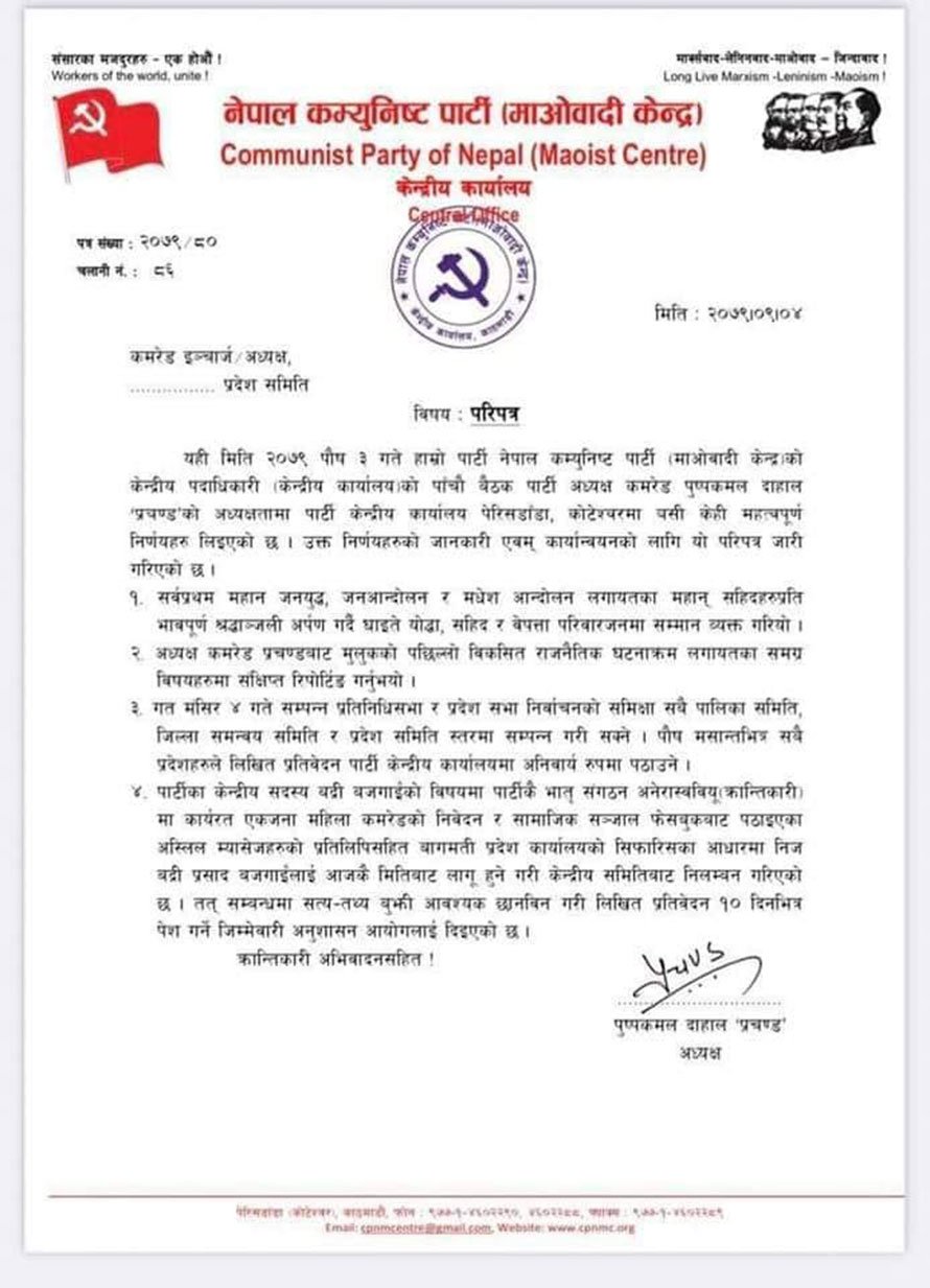प्रचण्डले मातहतका कमिटीलाई चार बुँदे सर्कुलर पठाए