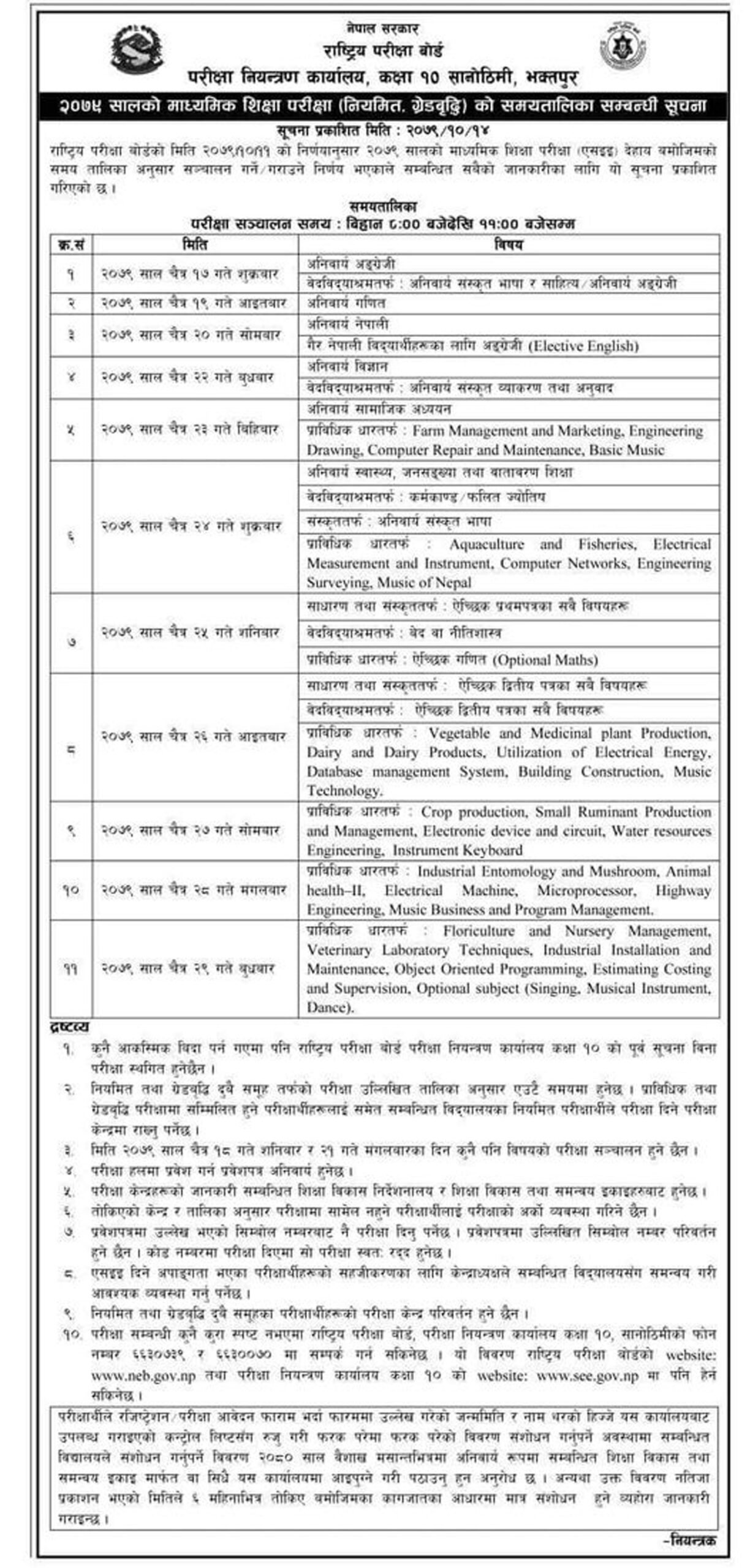 काठमाडौं । राष्ट्रिय परीक्षा बोर्डको बैठकले माध्यमिक शिक्षा परीक्षा (एसईई) चैत १७ देखि २९ गतेसम्म गर्ने निर्णय गरेको छ ।