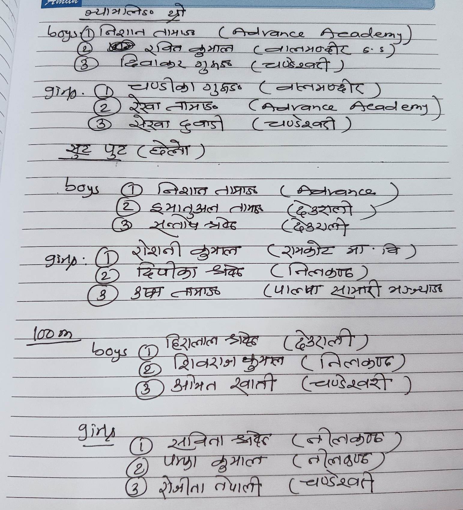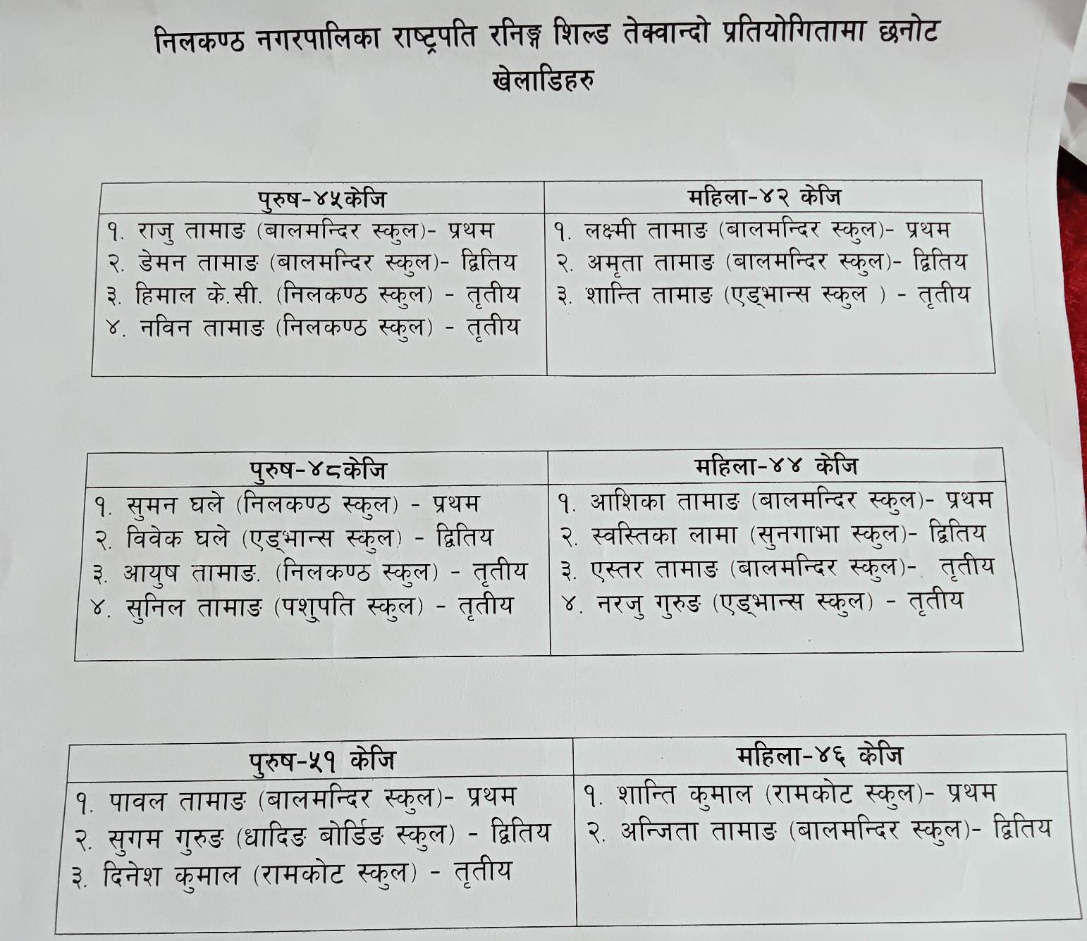 विभिन्न विधाका खेलहरुको नतिजा अनुसार नीलकण्ठ माध्यामिक विद्यालय १२ स्वर्ण सहित प्रथम अग्रस्थानमा छ भने ५ स्वर्ण सहित बाल मन्दिर दोस्रो र ४ स्वर्ण सहित एड्भान्स तेस्रो पोजिशनमा छन् ।