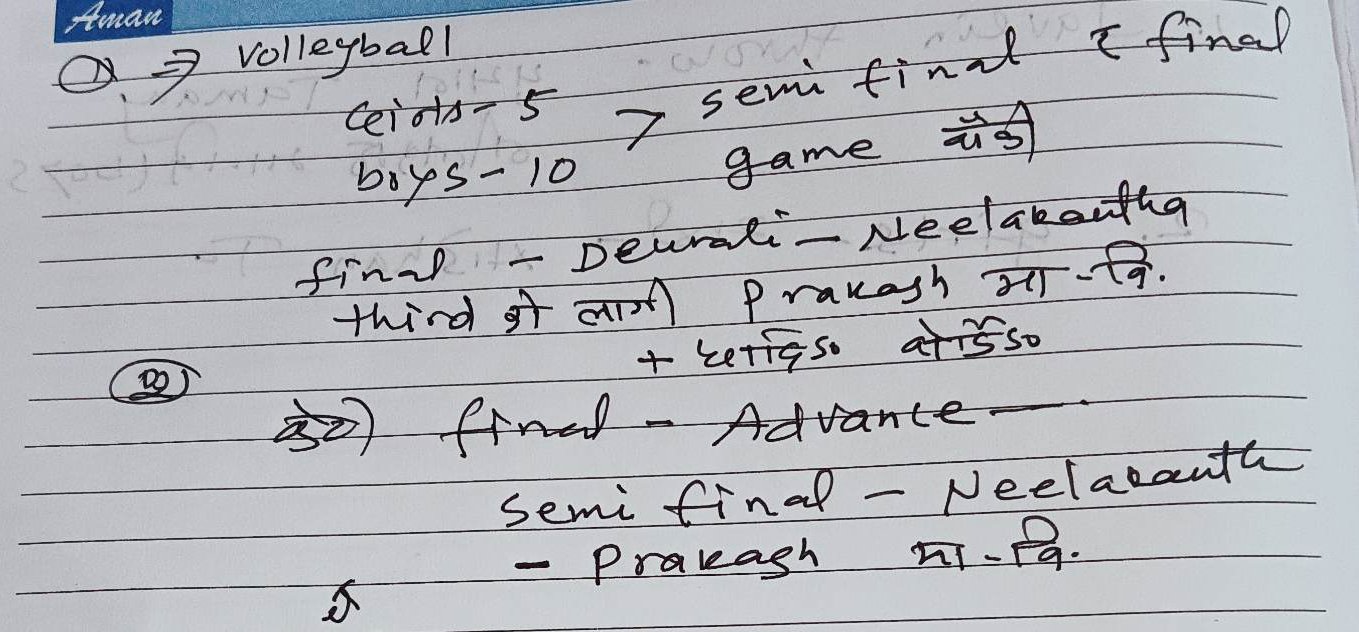 अधिकांश खेलहरुको फाईनल पनि आईतबार नै हुने भएका छन् । भलिबल पुरुष तर्फ नीलकण्ठ मावि र देउराली मावि बीच हुने भएको छ भने छात्रा तर्फ एड्भान्स एकेडेमी फाईनल पुगेको छ भने अर्को टिम भोली बिहान हुने आर्को सेमिफाईनबाट टुङ्गो लाग्ने छ । यस्तै कबड्डी तर्फ पनि फाईनल खेल भोली नै हुने छ भने एथलेष्टिकका खेलहरु पनि भोली सकिने बताईएको छ । तेक्वान्दो र कराँतेका सम्पूर्ण खेलहरु सकिएको खेल तेक्वान्दोप्रशिक्षक रमेशमान तुलाधरले बताए ।