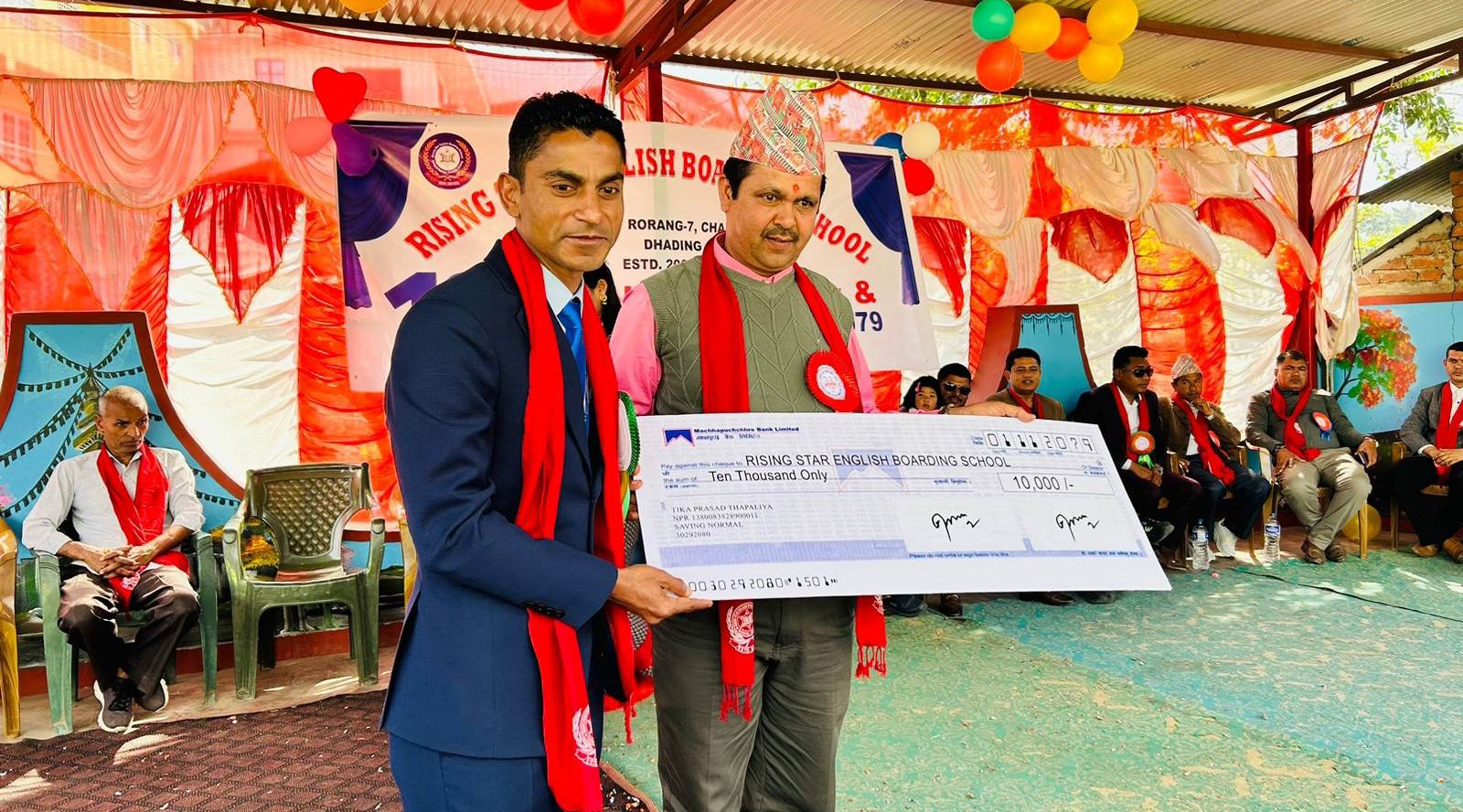 धादिङ । बेनीघाट रोराङ ७,चरौंदीमा रहेको राइजिङ स्टार इङ्लिस बोर्डिङ स्कुलले विभिन्न कार्यक्रम गरी १९ औँ वार्षिकोत्सव तथा अभिभावक दिवस मनाएको छ । विद्यालय ब्यवस्थापन समिती अध्यक्ष जीवनकुमार घिमिरेको सभापतित्व तथा बेनीघाट रोराङ गाउँपालिकाका अध्यक्ष कृष्ण बहादुर थपलिया (विवेर्क) को प्रमुख आतिथ्यतामा विद्यार्थीको पिटी तथा ड्रील लगायत मनोरञ्जनात्मक साङ्गीतिक प्रस्तुती सहित राइजिङ स्टार वार्षिक उत्सव सम्पन्न भएको हो ।