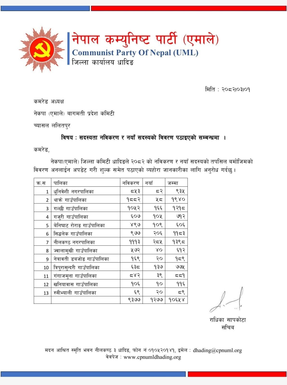 एमाले धादिङले बागमती प्रदेश कमिटीलाई पठाएको पार्टी सदस्य विवरणमा २०८२ को नविकरण र नयाँ सदस्यको संख्या नविकरण तर्फ ९ हजार ३७७ र नयाँ १ हजार २७७ जना गरि १० हजार ६५४ जना रहको उल्लेख गरिएको छ ।