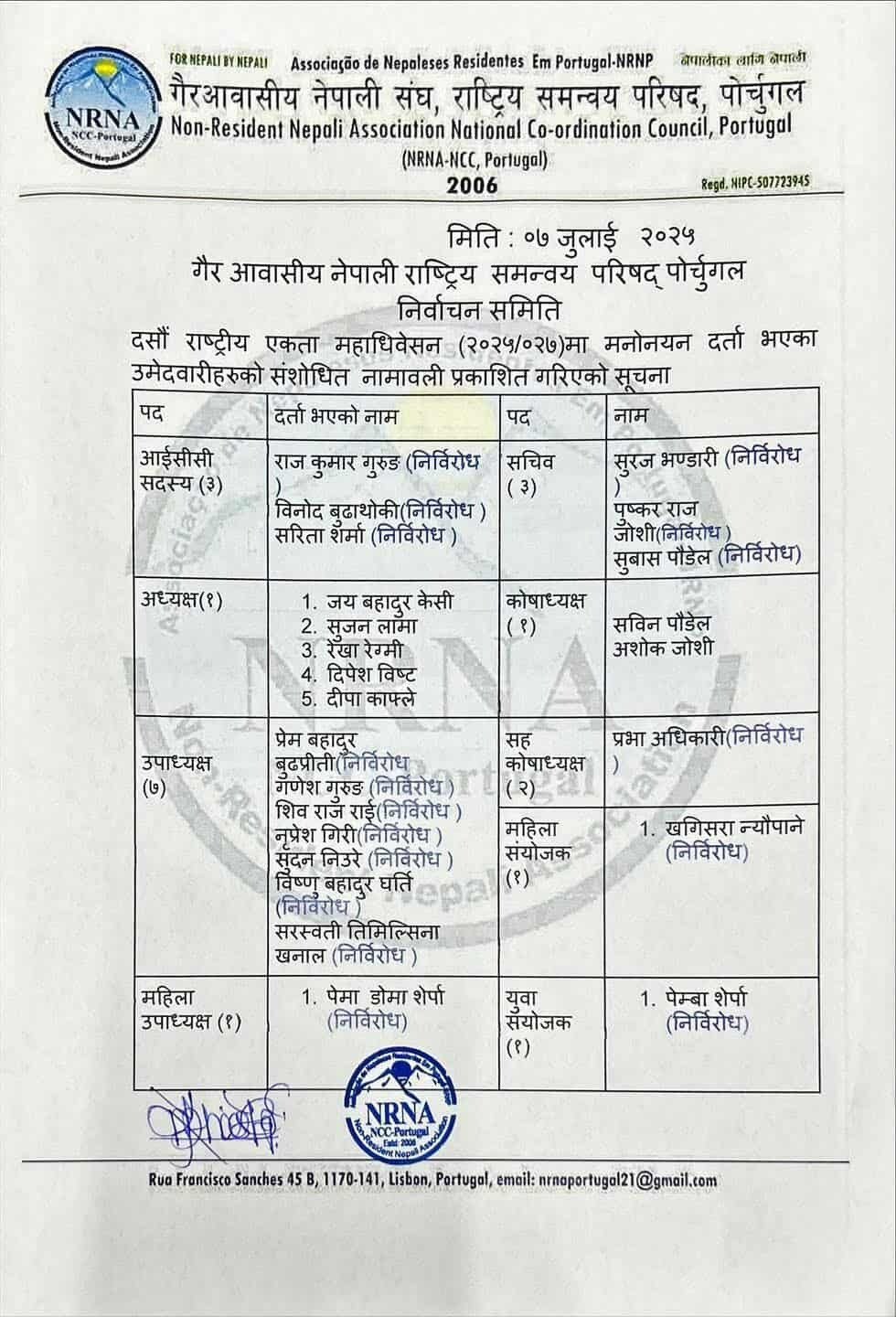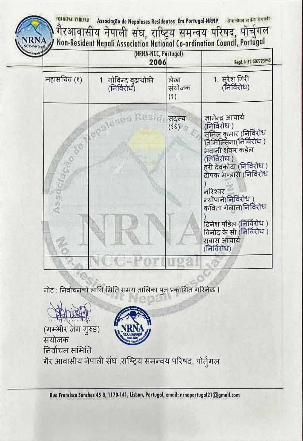 एनआरएनए पोर्चुगलमा जनप्रगतिशील मञ्चबाट ६ पदाधिकारी सहित ७ जना निर्विरोध