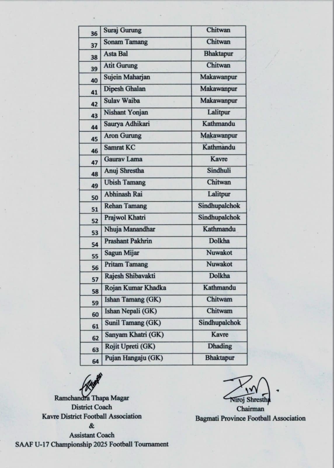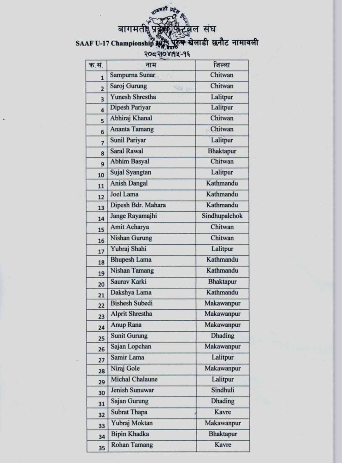 उक्त प्रतियोगिताका लागि राष्ट्रिय टिम बनाउन एन्फाले खेलाडी छनोट कार्य अगाडी बढाए सँगै धादिङ जिल्ला छनोटमा ४५ जना प्रदेश छनोटमा परेका मध्य तीन जनाले प्रदेश छनोट चरण पार गर्दै केन्द्रिय छनोट प्रतियोगितामा पुगेका छन् । अब हुने केन्द्रिय छनोट पार गरे राष्ट्रिय टिमबाट खेल्न पाईने छ ।