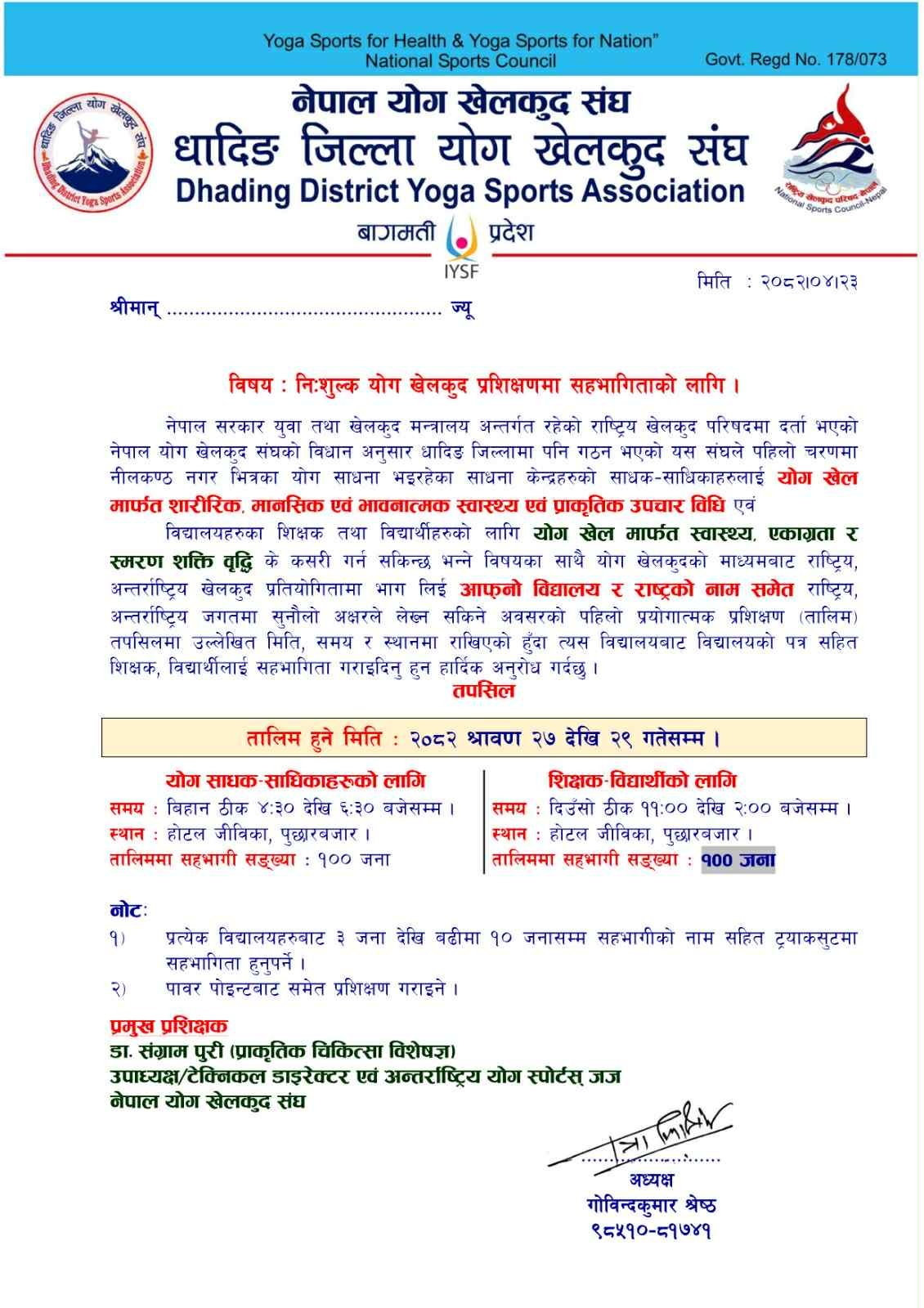 धादिङ । घादिङ जिल्ला योग खेलकुद संघले यहि साउन श्रावण २७ देखि २९ गतेसम्म निःशुल्क योग खेलकुद प्रशिक्षणकाे आयोजना गर्ने भएकाे छ ।