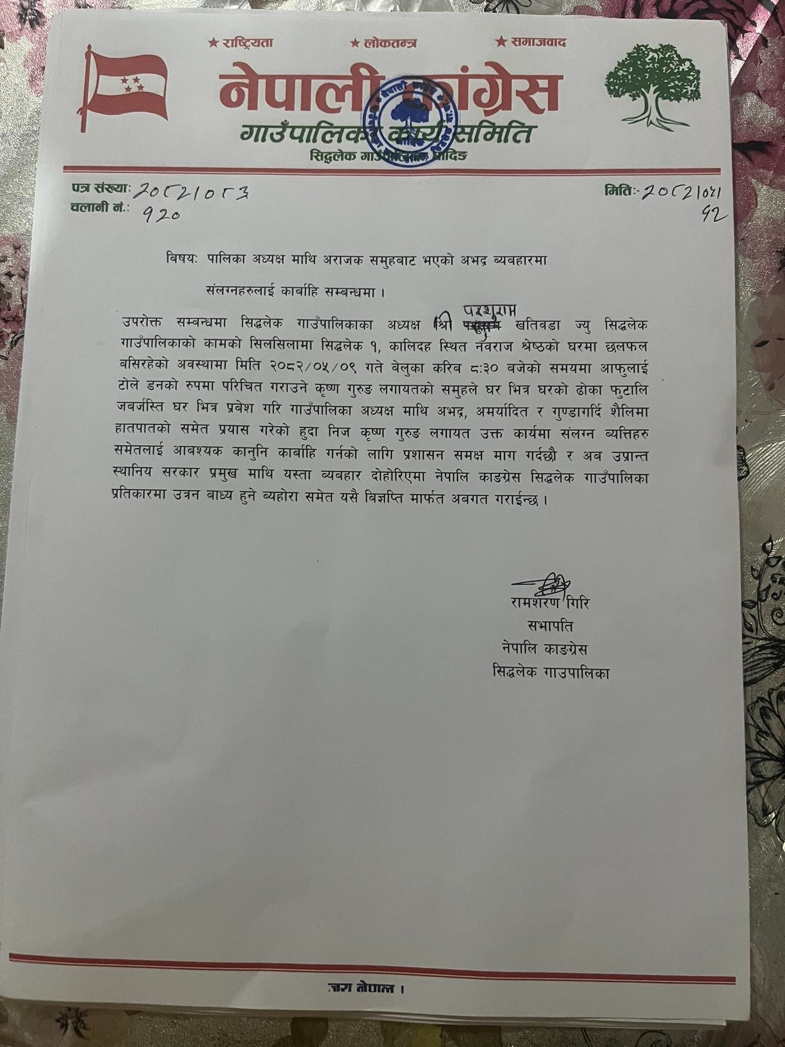 यद्यपि घटना भदौ ९ गते घटेपनि कांग्रेस सिद्धलेकले विज्ञप्ति भने बिहीबार मात्रै सार्वजनिक गरेको हो।