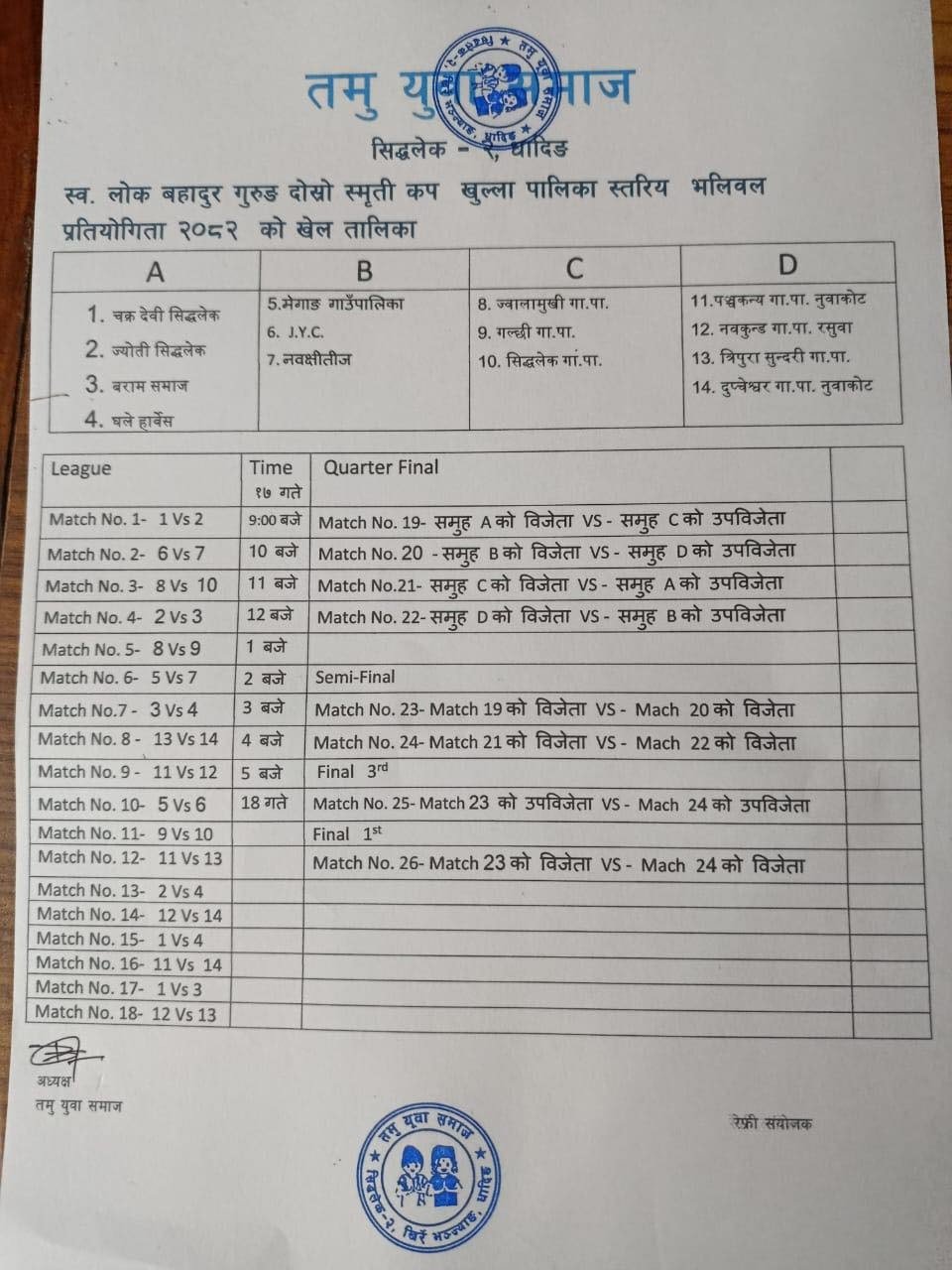 धादिङ, नुवाकोट, रसुवा र गोरखाका गरी १४ टोली सहभागी हुने प्रतियोगिता लिग कम नकआउट आधारमा हुनेछ । सहभागी टिमलाई चार समूहमा विभाजन गरिएको जिल्ला भलिबल संघ धादिङका अध्यक्ष तथा नलाङ पात्ले माविका शिक्षक अमृत (तिलक) गुरुङले जानकारी दिनुभयो ।