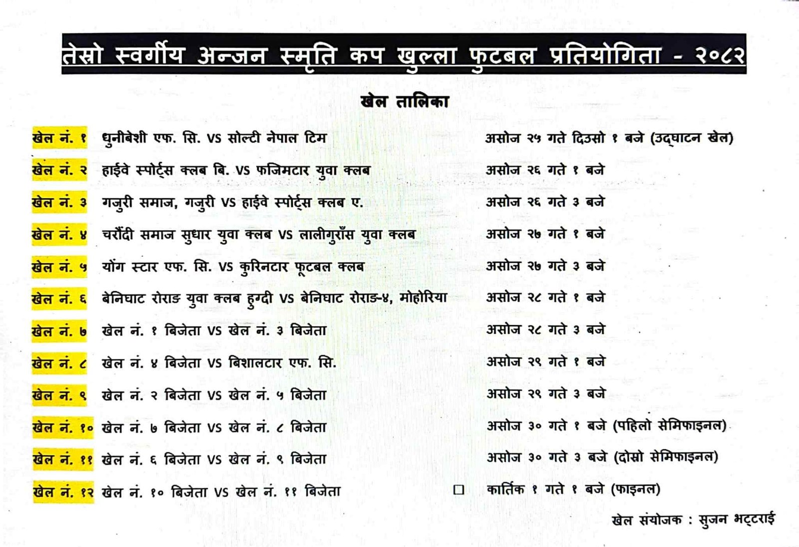खेल तालिका अनुसार अन्तिम फाइनल खेल कात्तिक १ गते दिउँसो १ बजे हुने कार्यक्रम रहेको छ।