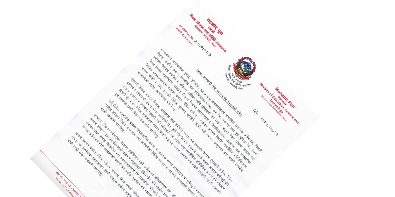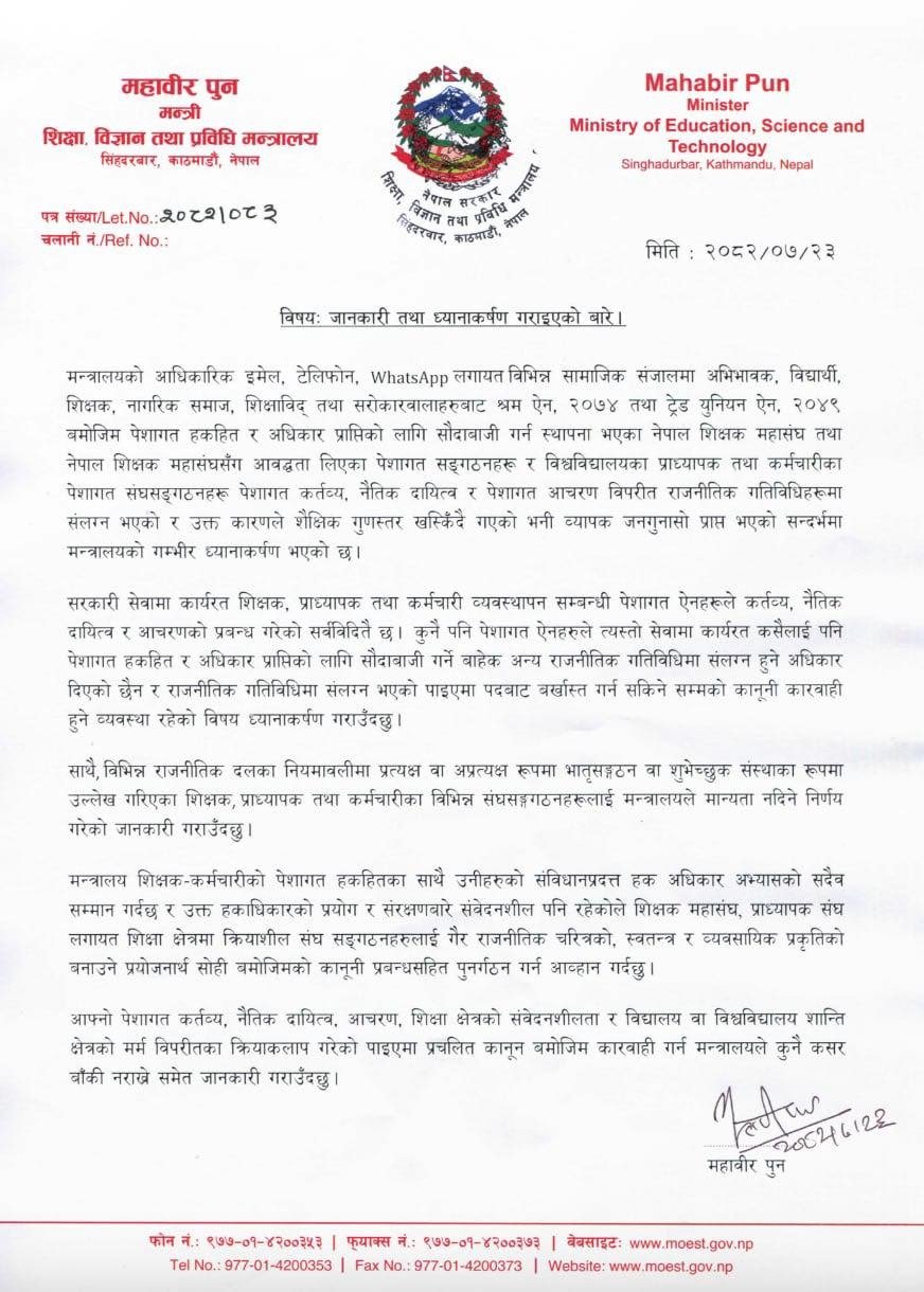मन्त्री पुनले कार्तिक २३ गते सूचनामार्फत विभिन्न माध्यमहरू — इमेल, टेलिफोन, WhatsApp लगायत सामाजिक सञ्जालमार्फत प्राप्त गुनासाहरूको आधारमा शिक्षा क्षेत्रका केही संघ–संगठनहरूले राजनीतिक गतिविधिमा संलग्न भएको देखिएकाले गम्भीर ध्यानाकर्षण भएको बताएका छन्।