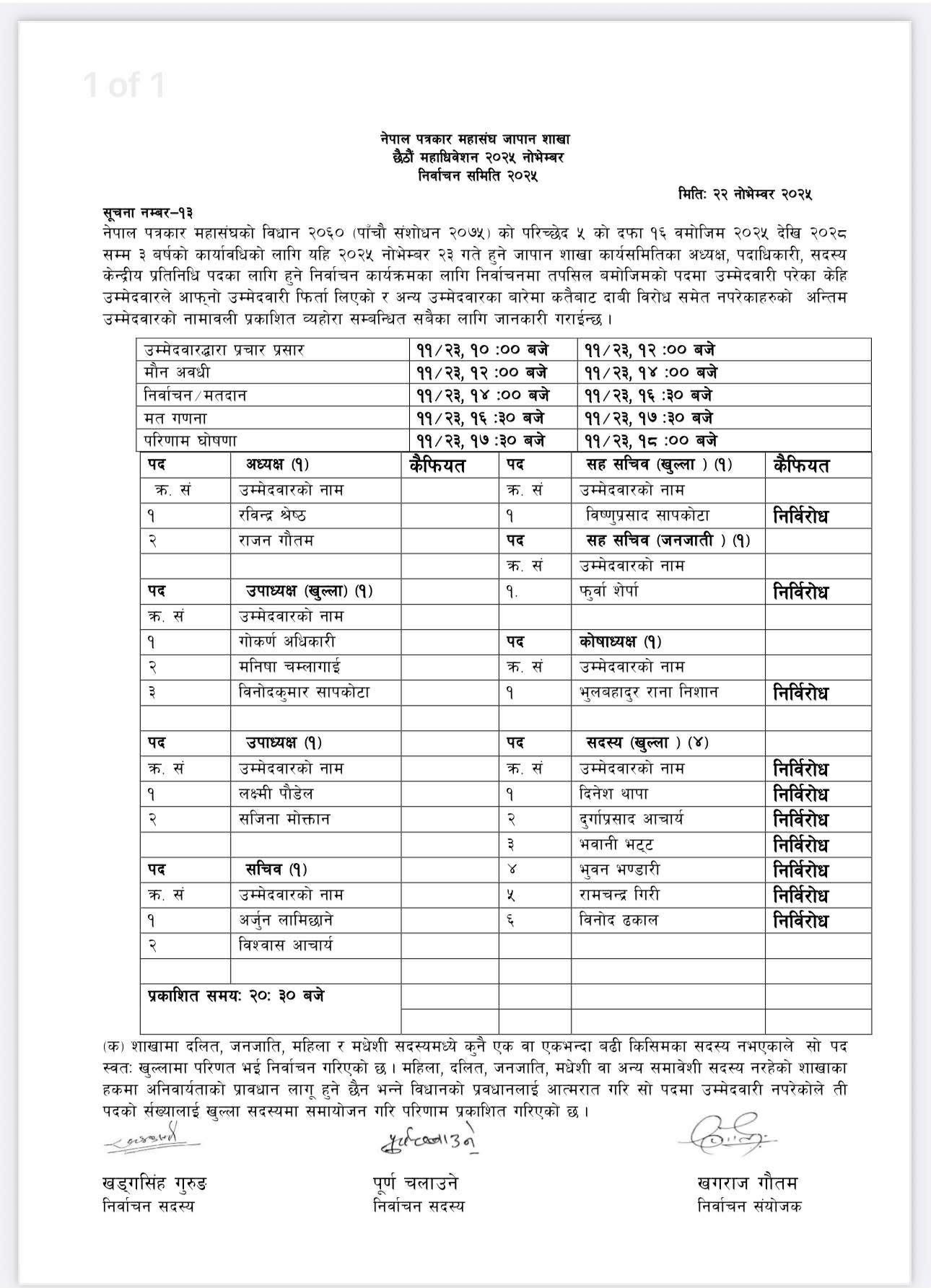 धादिङ । नेपाल पत्रकार महासंघ जापान शाखाको नयाँ नेतृत्व चयनका लागि निर्वाचन आज हुँदै छ। तर मतदान अघि नै धादिङका दुई पत्रकार कार्य समिति सदस्यमा निर्विरोध भएका छन्।