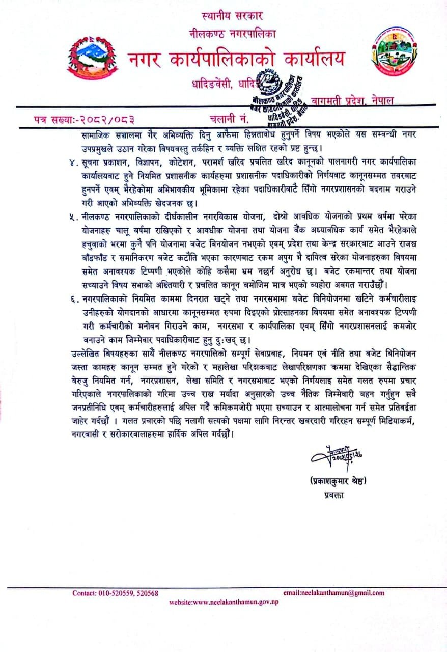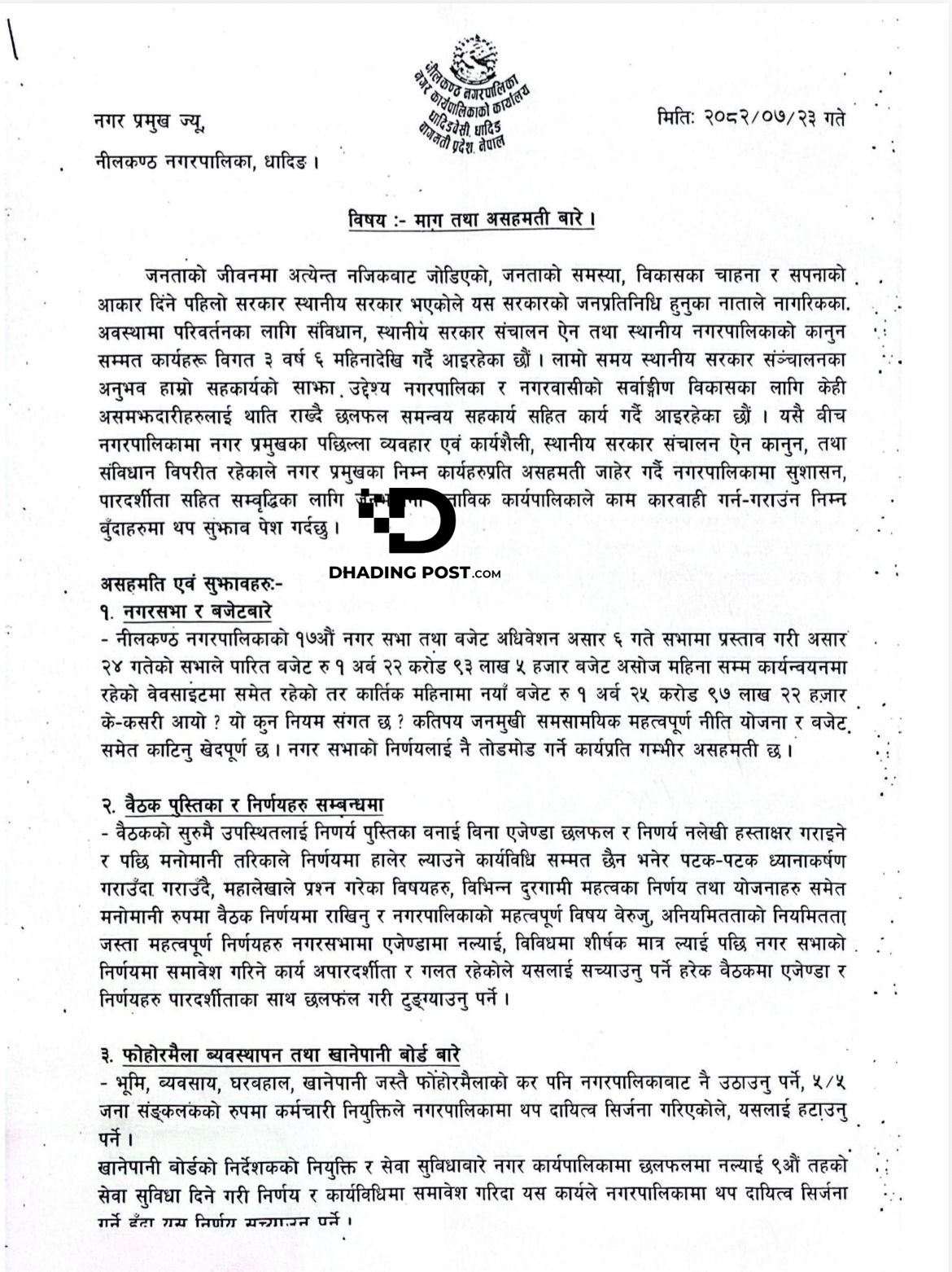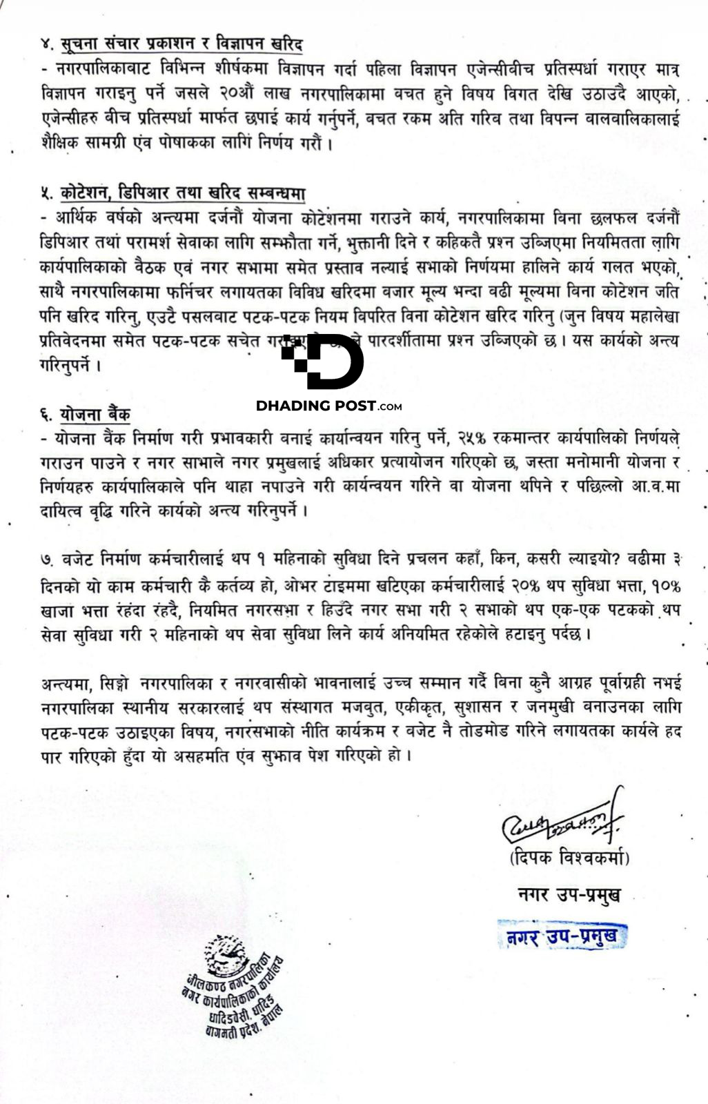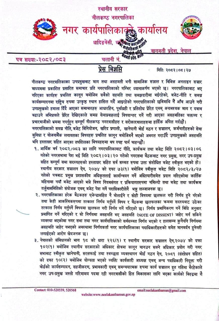 धादिङ । नीलकण्ठ नगरपालिकाका उपप्रमुख दिपक विश्वकर्माले नगरपालिकामा भएको बजेट हेरफेर प्रकरणबारे ७ बुँदे असहमति पत्र पेश गरी सार्वजनिक गरेपछि नगरपालिकाका प्रवक्ताले त्यसविरुद्ध ६ बुँदे खण्डन सार्वजनिक गरेका छन्।