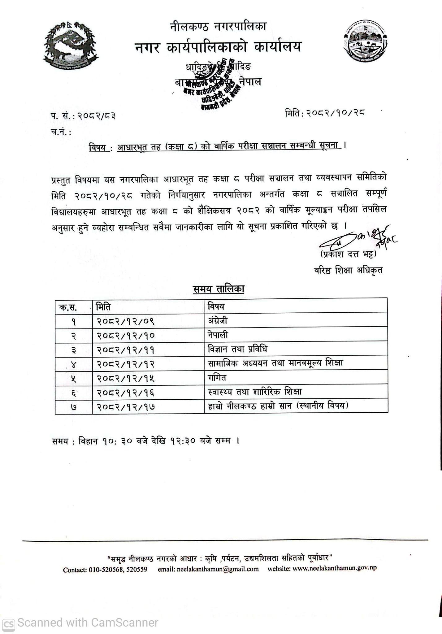 यसरी नीलकण्ठ नगरपालिका स्तरीय कक्षा ८ को परीक्षामा कुल १२०७ विद्यार्थी सहभागी हुने तयारी पूरा भएको छ । परीक्षा व्यवस्थापनका लागि आवश्यक सम्पूर्ण तयारी अन्तिम चरणमा पुगेको नगरपालिकाले जनाएको छ ।