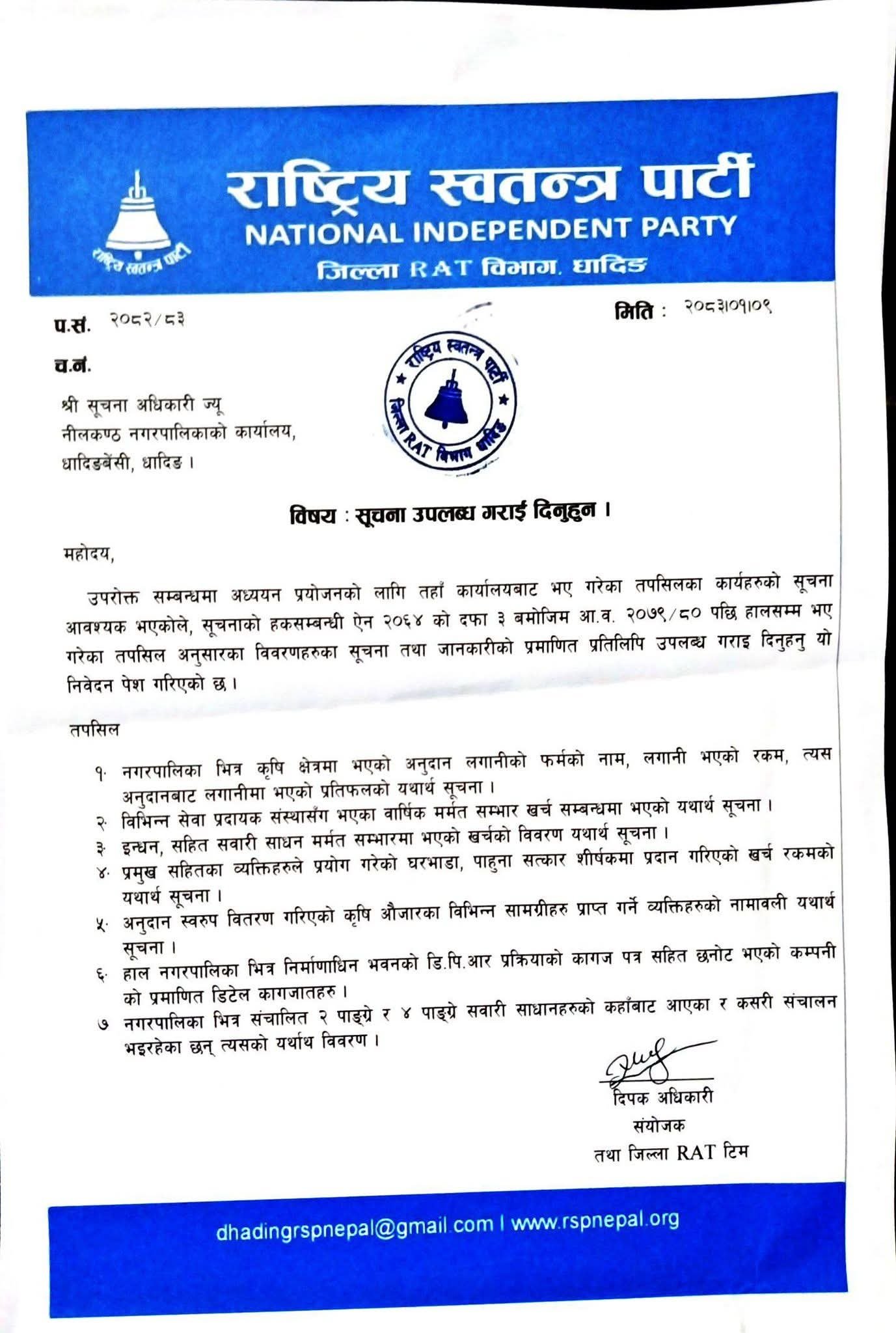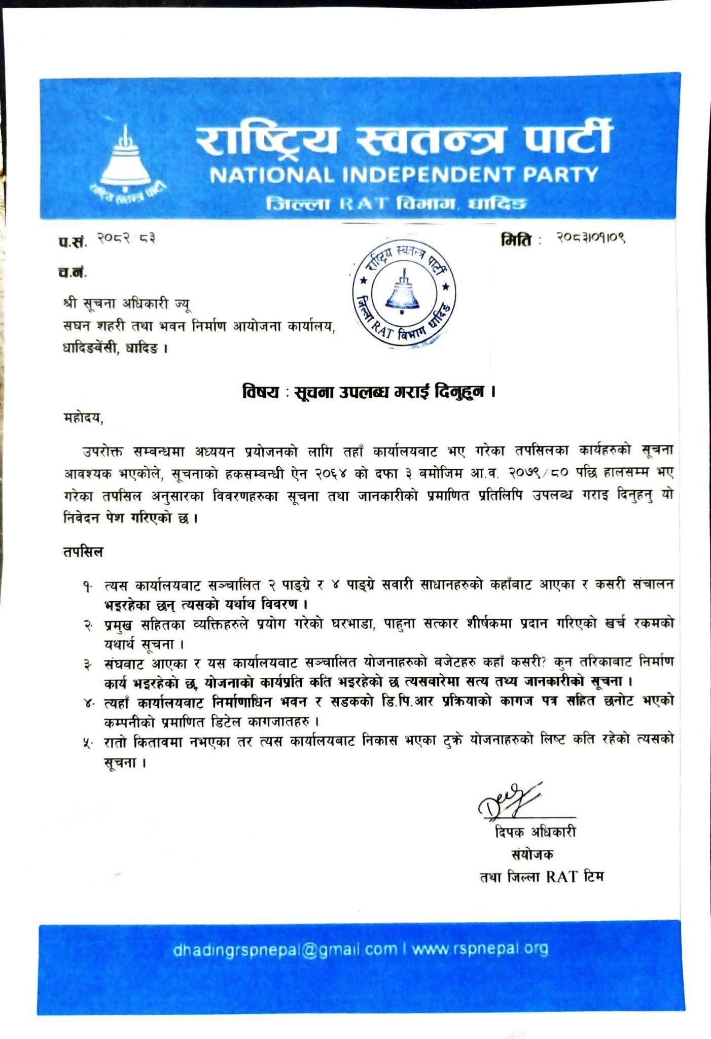 जिल्ला संयोजक दीपक अधिकारीको हस्ताक्षरमा बुझाएको पत्रमार्फत नीलकण्ठ नगरपालिका र सघन शहरी तथा भवन निर्माण आयोजना कार्यालय सँग सूचना माग गरिएको हो ।