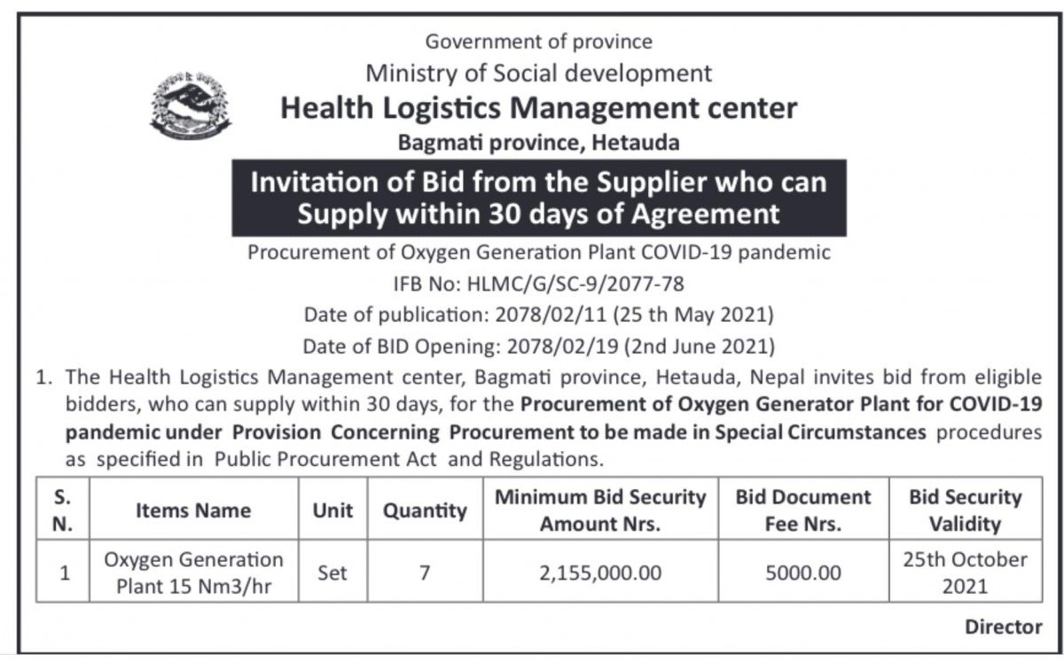 धादिङ अस्पताल सहित ७ वटा अस्पतालमा अक्सिजन प्लान्ट निर्माण गर्न बोलपत्र आह्वान